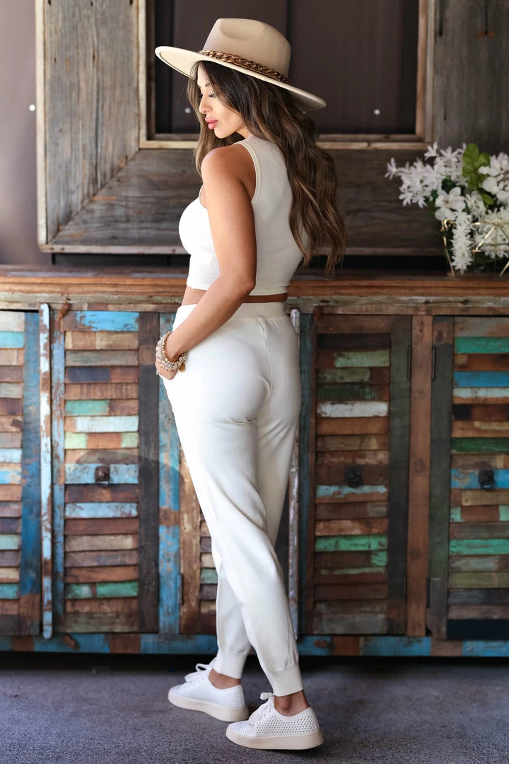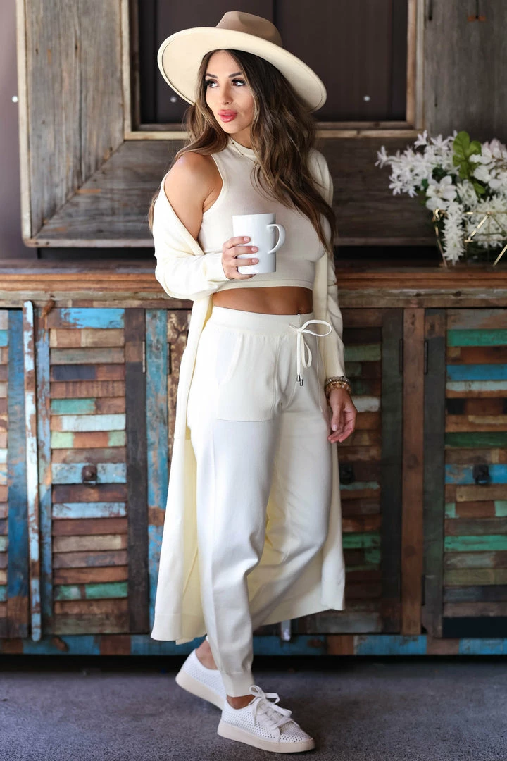 Ivory, knit, women’s matching loungewear crop top, joggers, and cardigan. Crop Top features sleeveless design, high neckline, and ribbed trim. Joggers feature elastic waistband with functional drawstring, pockets, ribbed trim, and banded hem. Duster Cardigan features long sleeves, ribbed trim, pockets, and self-tie belt option.