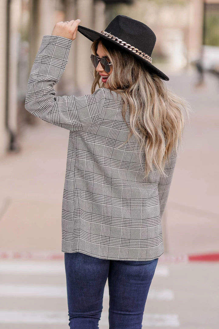 CBRAND, black and white, women’s plaid, open-front boyfriend fit blazer featuring notched lapel collar, pockets, and long sleeves with roll tab option. Lined.
