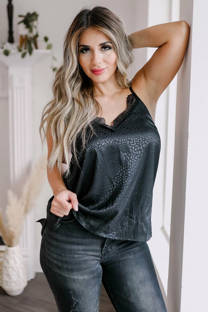 Black, satin, women’s spotted cami featuring v-neckline with lace trim, adjustable spaghetti straps, side split hem design, and elastic band at back.