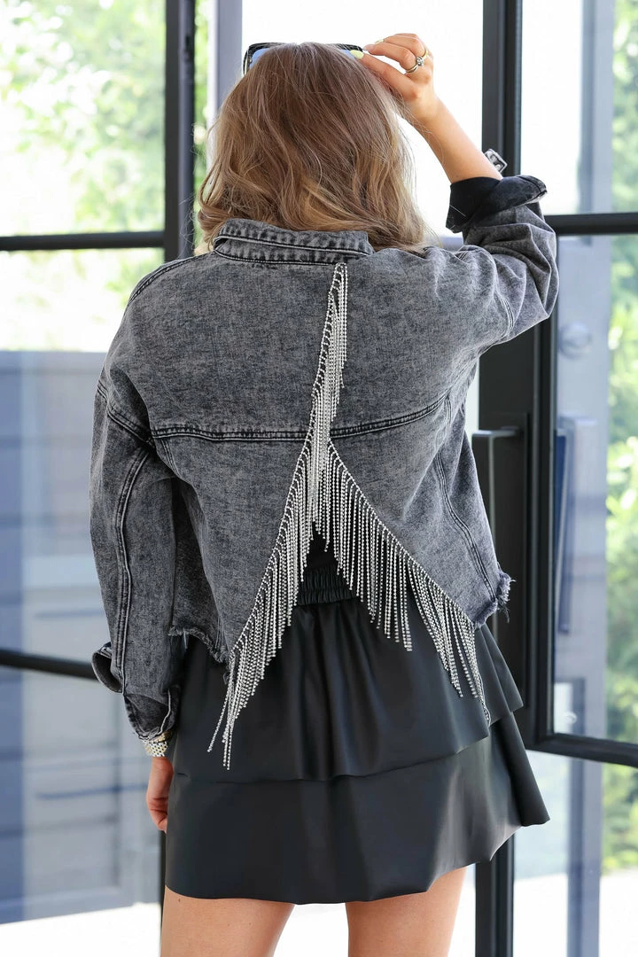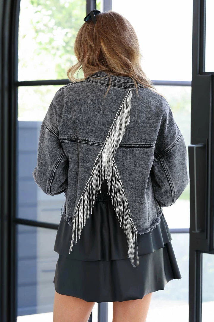 Black denim jacket featuring open back design with rhinestone fringe, basic collar, long sleeves, button closure at front and cuffs, raw hem design, and chest pockets with flap button closure.