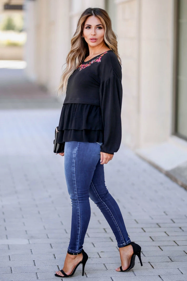 Be the queen of the garden in this simply detailed top! The cute floral embroidery pairs with the ruffled hem and balloon sleeves for the perfect feminine look.