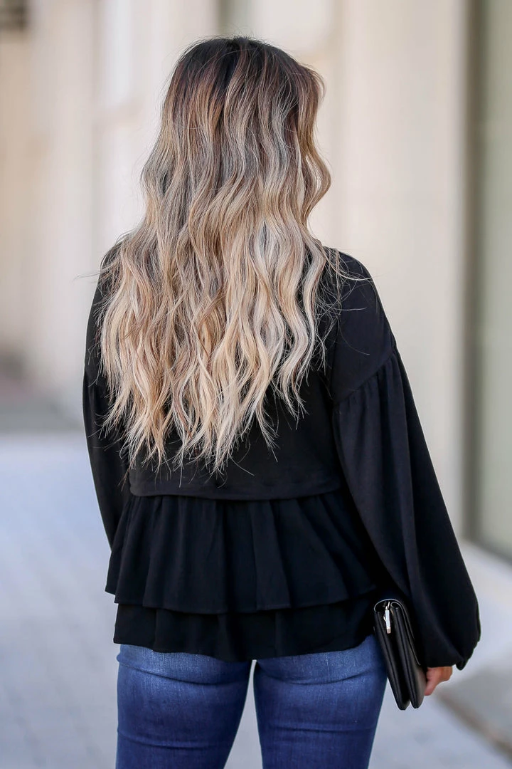 Black, women’s knit babydoll top featuring round neckline, beautiful floral embroidery, woven ruffled contrast at hem, and long balloon sleeves with elastic cuffs.