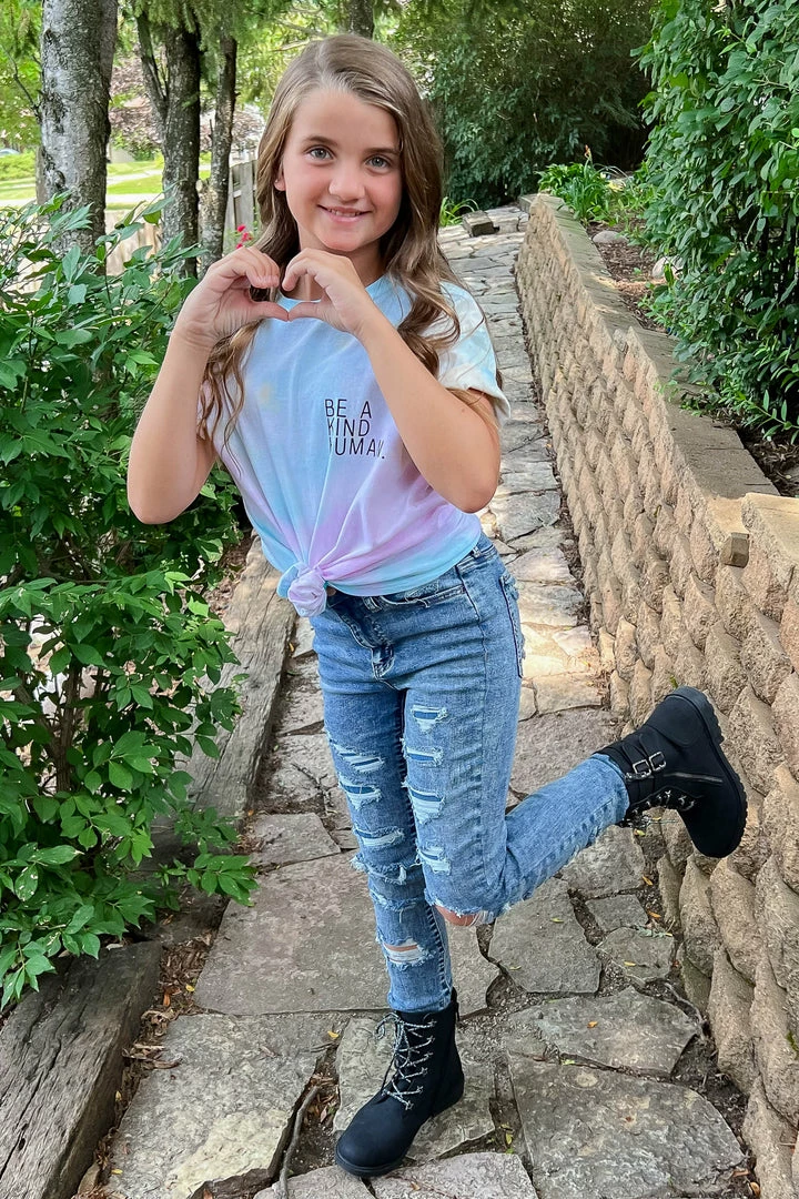 Children’s black, combat-style boots featuring zipper closure at interior, treaded sole, metallic lace-up design with star eyelets, and zipper and buckle details at outside.