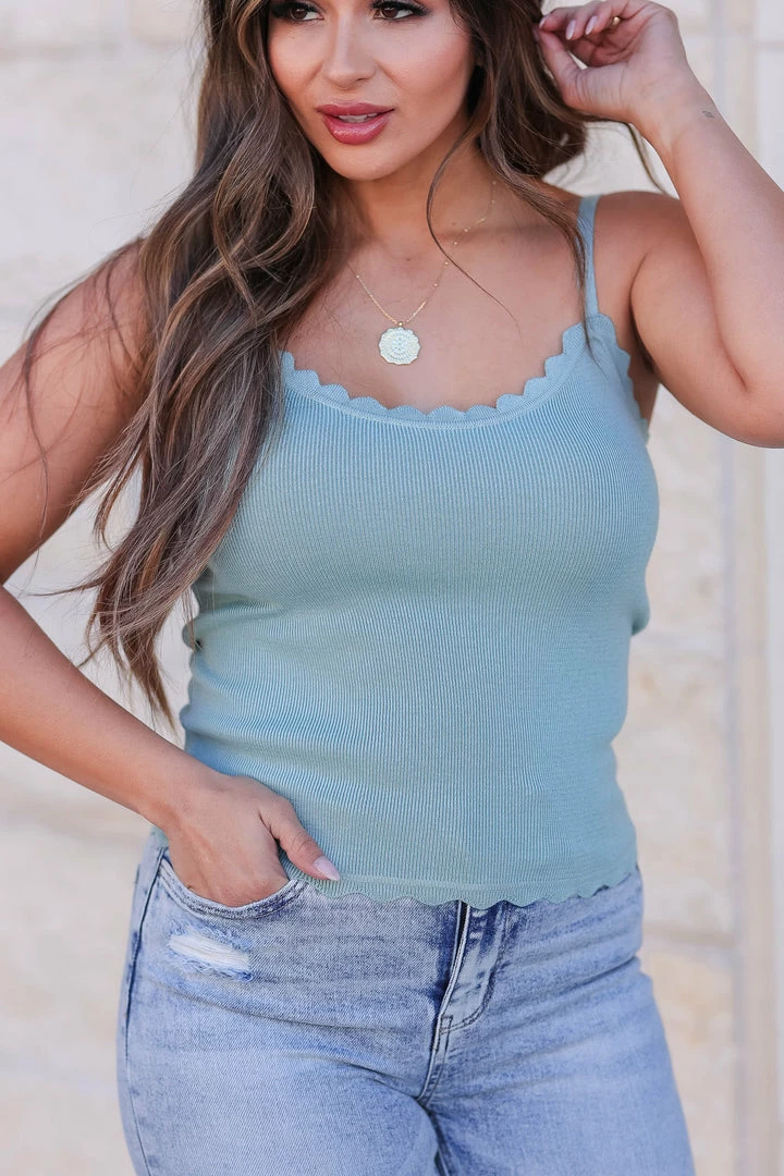 Women’s sleeveless ribbed cami featuring scalloped neck and hem.Â