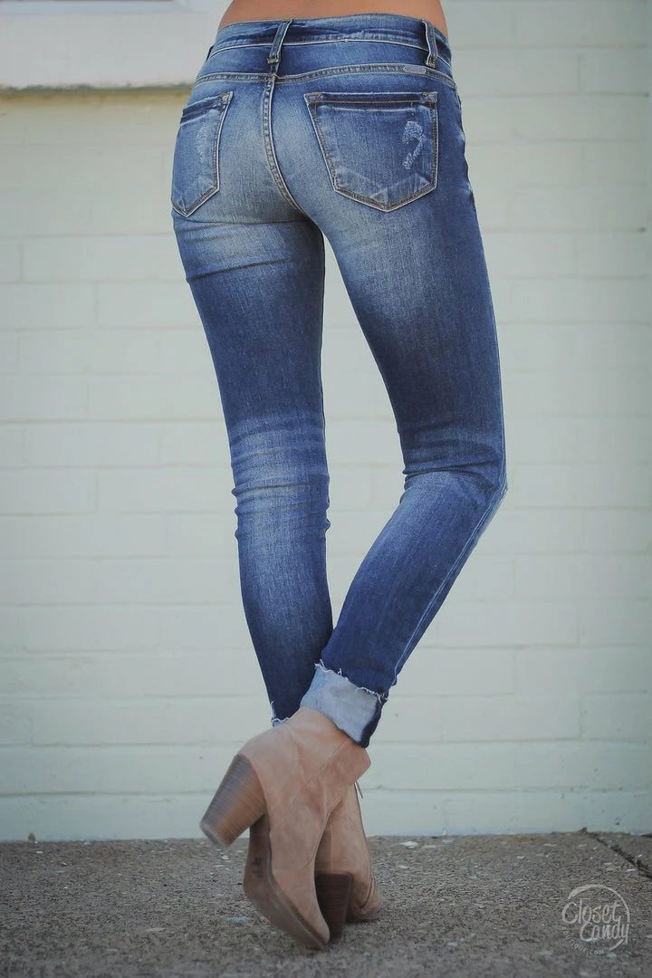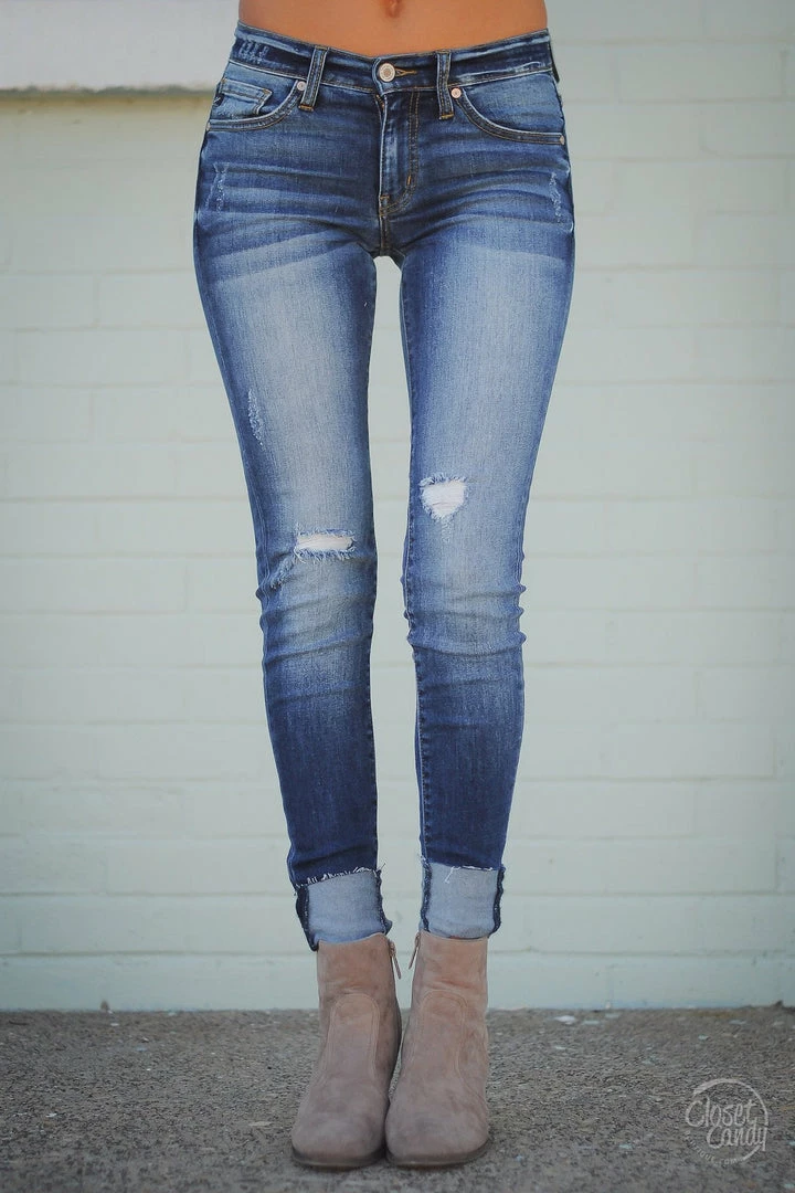 Kan Can, medium wash, distressed skinny jeans with classic 5-pocket design and zipper with button closure. Mid-rise style. Raw edge, optional cuffed or un-cuffed hem. Slight distressing on back of pockets. *Please note distressing will vary with each unique piece.
