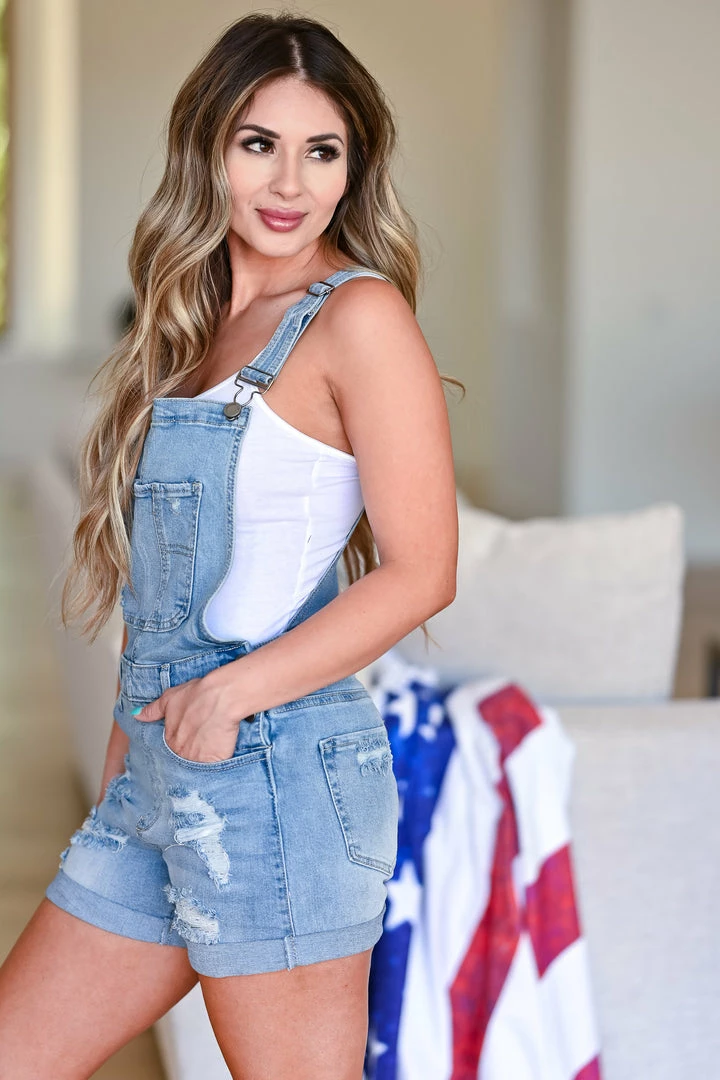 Light wash, distressed, women’s denim overall shorts featuring adjustable racerback straps with clasp closures at front, chest pocket, side button closure at waist, classic 5-pocket design, and cuffed hem. Distressing may vary.