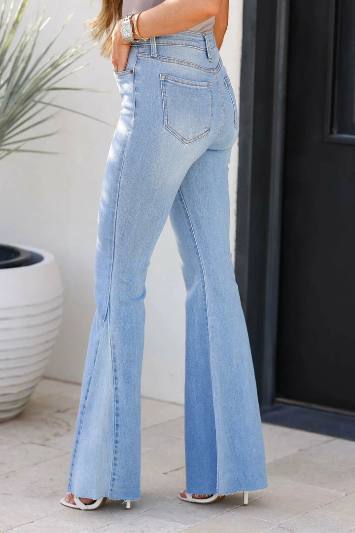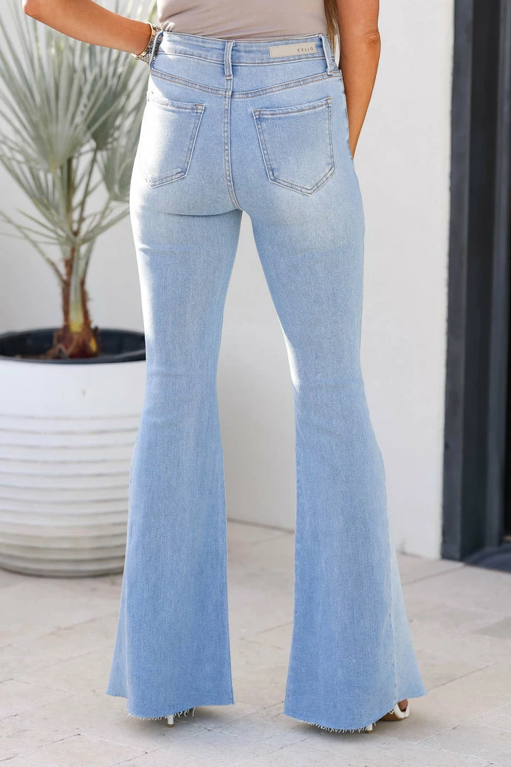 Cello, light wash super high rise flare jeans featuring side panel contrast denim design, frayed hem, classic 5-pocket design and button front, zip fly closure.