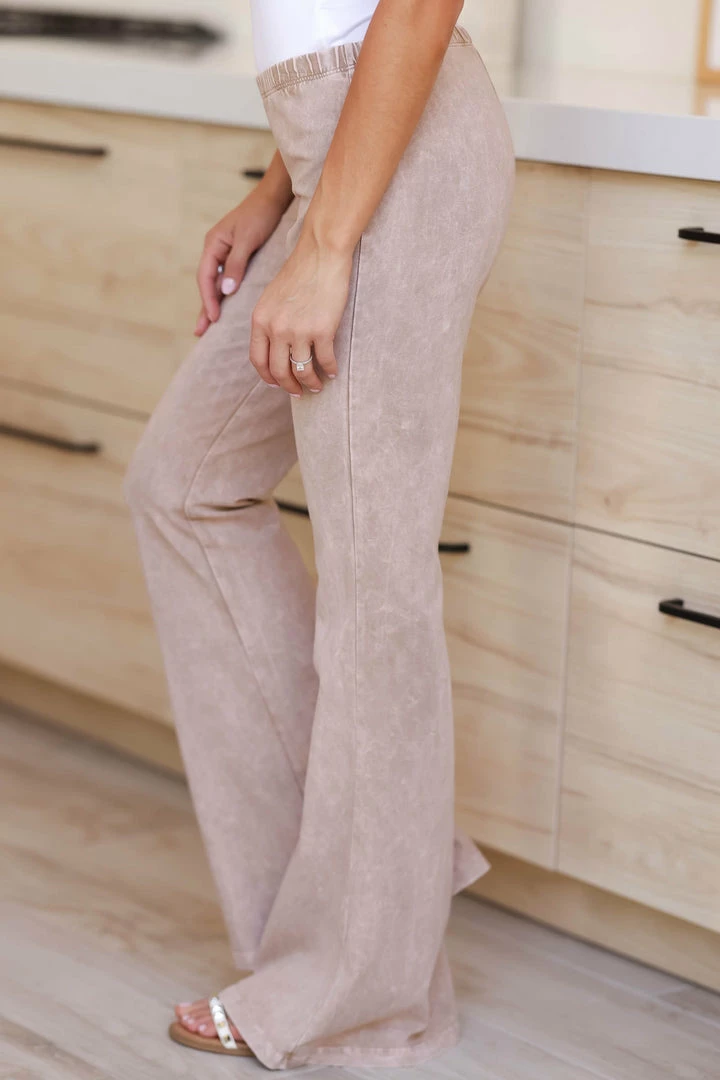Beige, women’s mineral washed flared pull on pants featuring elastic waistband. Made in USA!