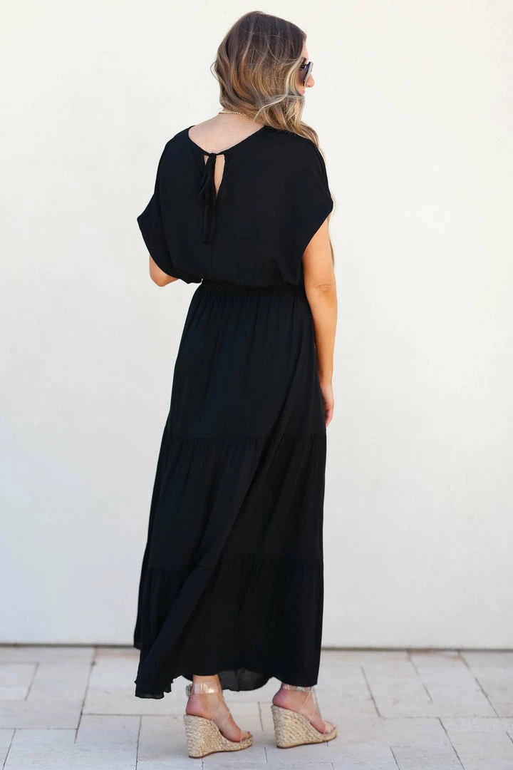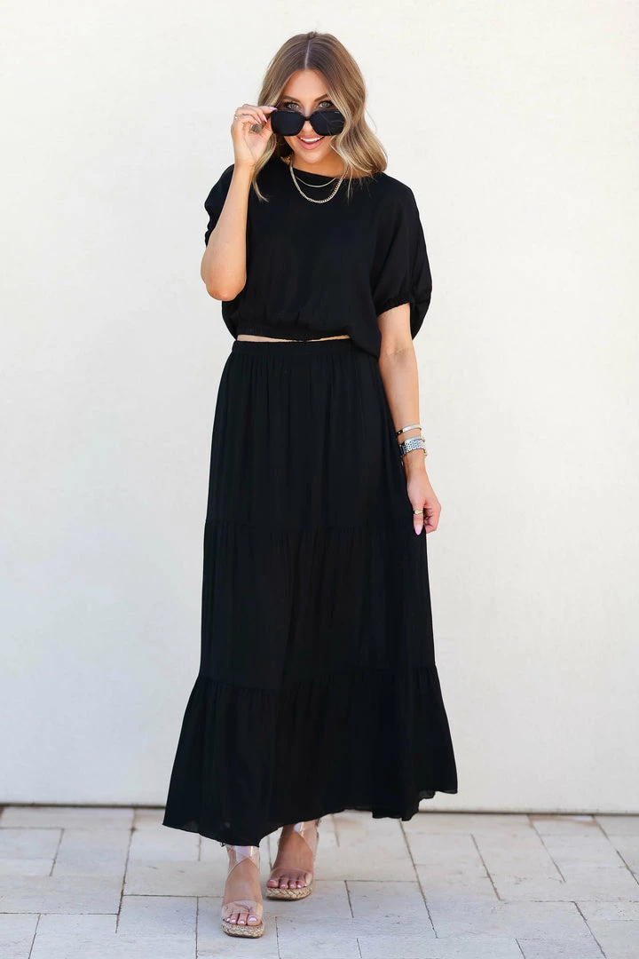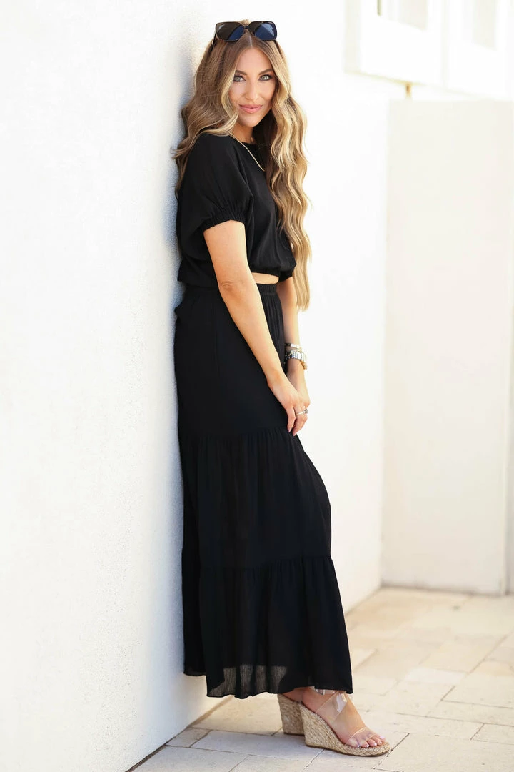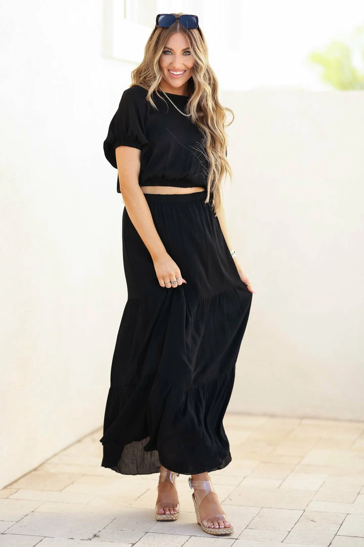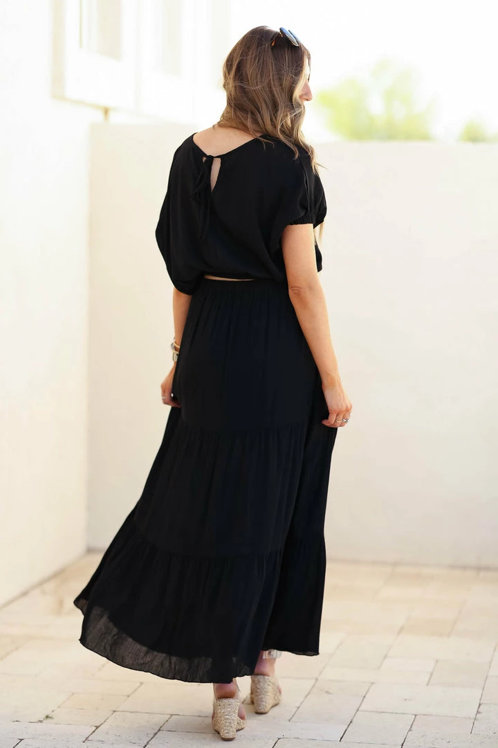 Black, short sleeve cropped top featuring split V detail with self tie on back and elastic sleeves and hem. Matching maxi skirt features elastic waistband and tiered ruffle design. Lined.