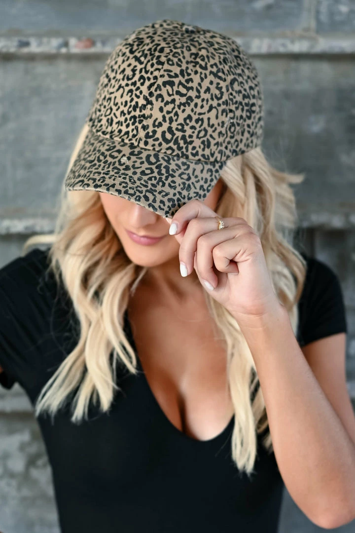 Leopard print, women’s baseball style hat with slight distressing and adjustable strap at back. One size fits most.
