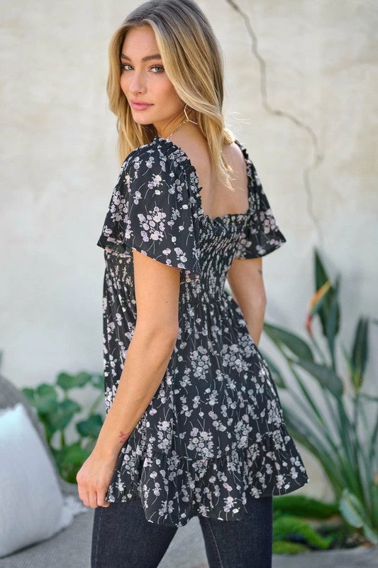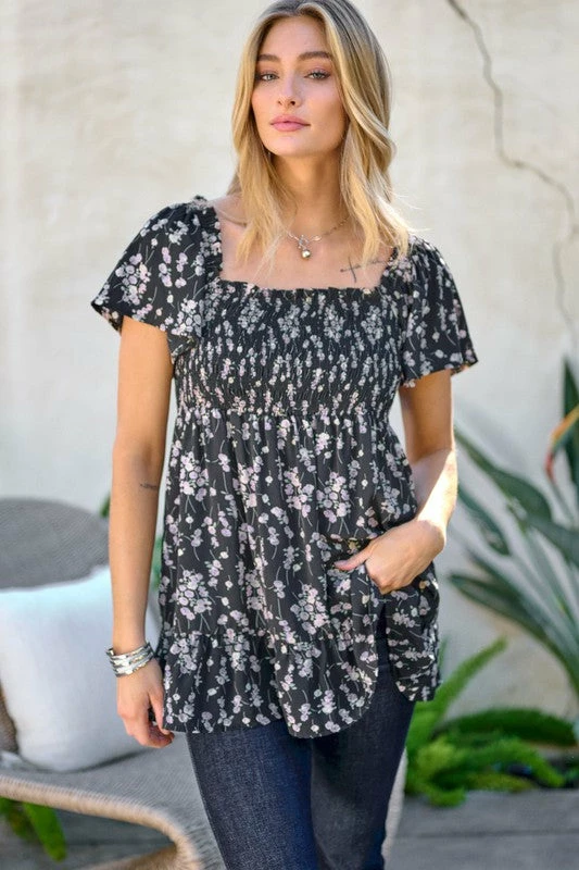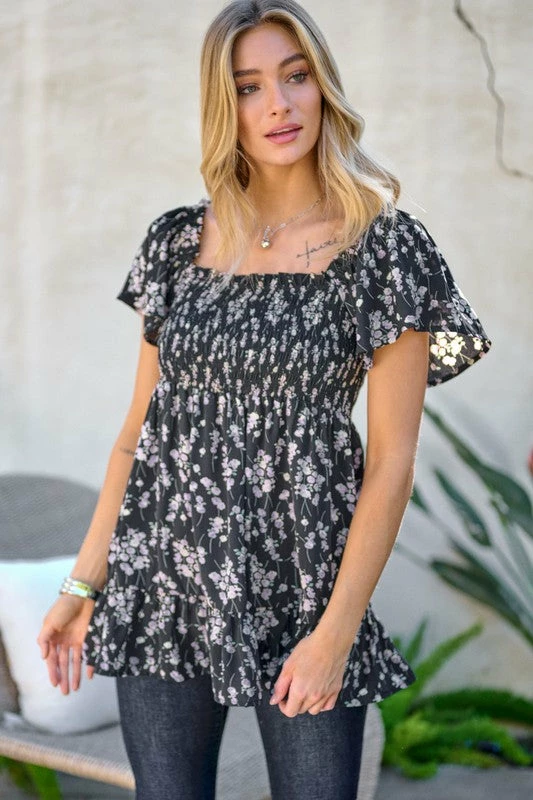FLORAL PRINTED V NECK SHORT SLEEVE RUFFLE TOP. 95% POLYESTER 5% SPANDEX.