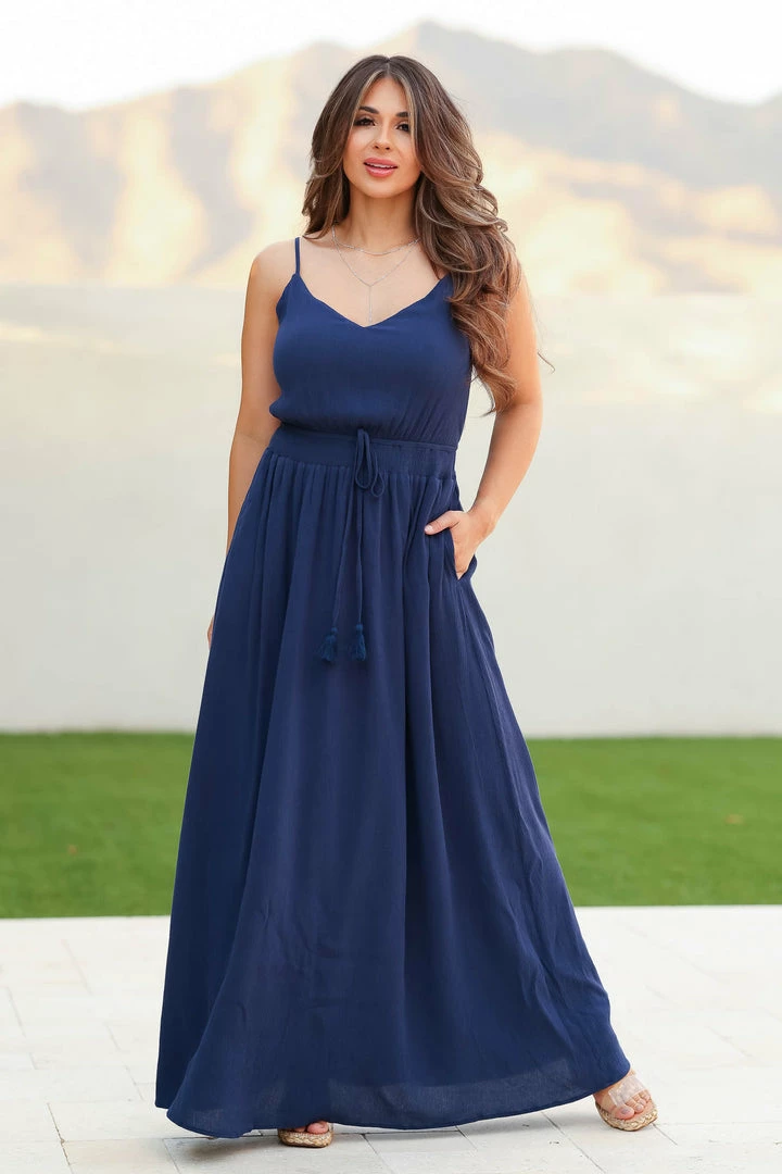 Navy, sleeveless, maxi dress featuring adjustable spaghetti straps, v-neckline, smocked waistline with decorative ribbon, self-tie ribbon detail on back, and side pockets. Lined.