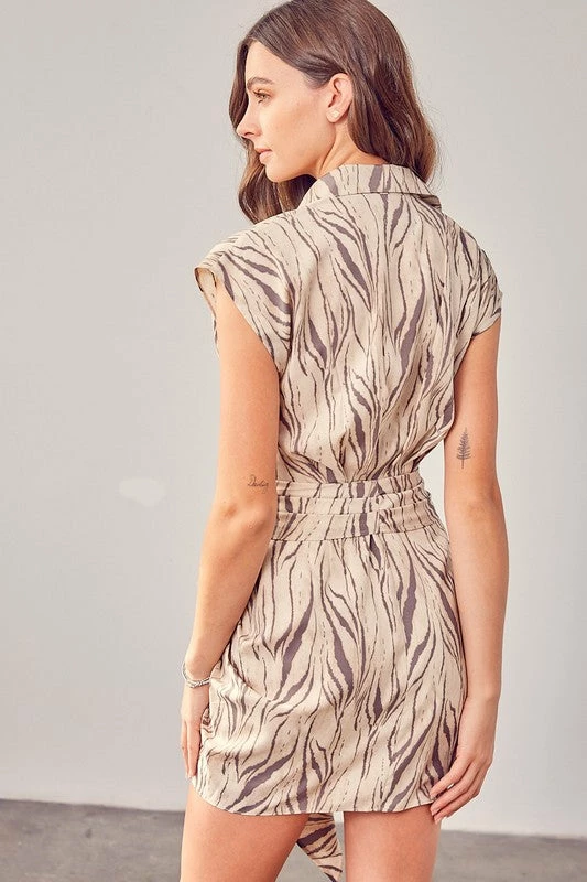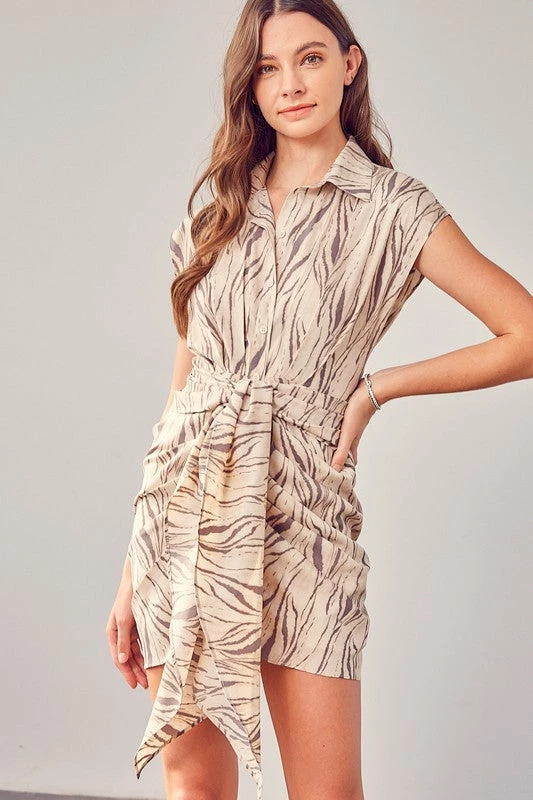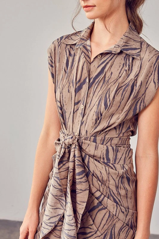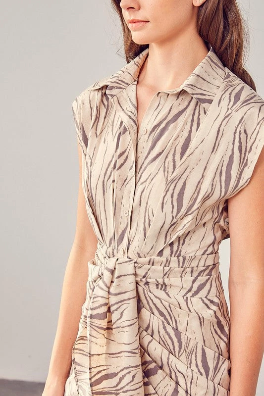 ELEGANT ANDS FLIRTY ZEBRA PRINT FRONT TIE DRESS, BUTTON TOP, COLLARED, SLEEVELESS.