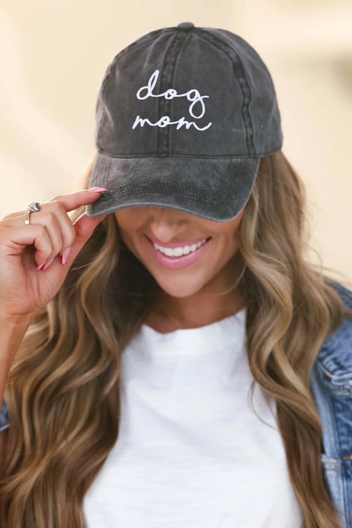 Black, vintage washed baseball cap featuring white “Dog Mom” cursive embroidery on front and adjustable strap on back.
