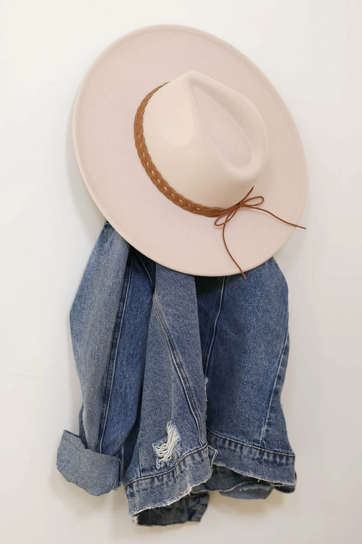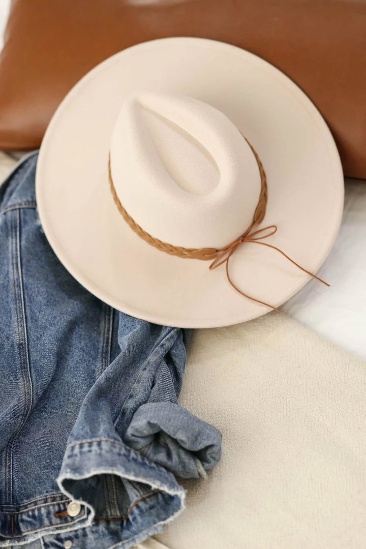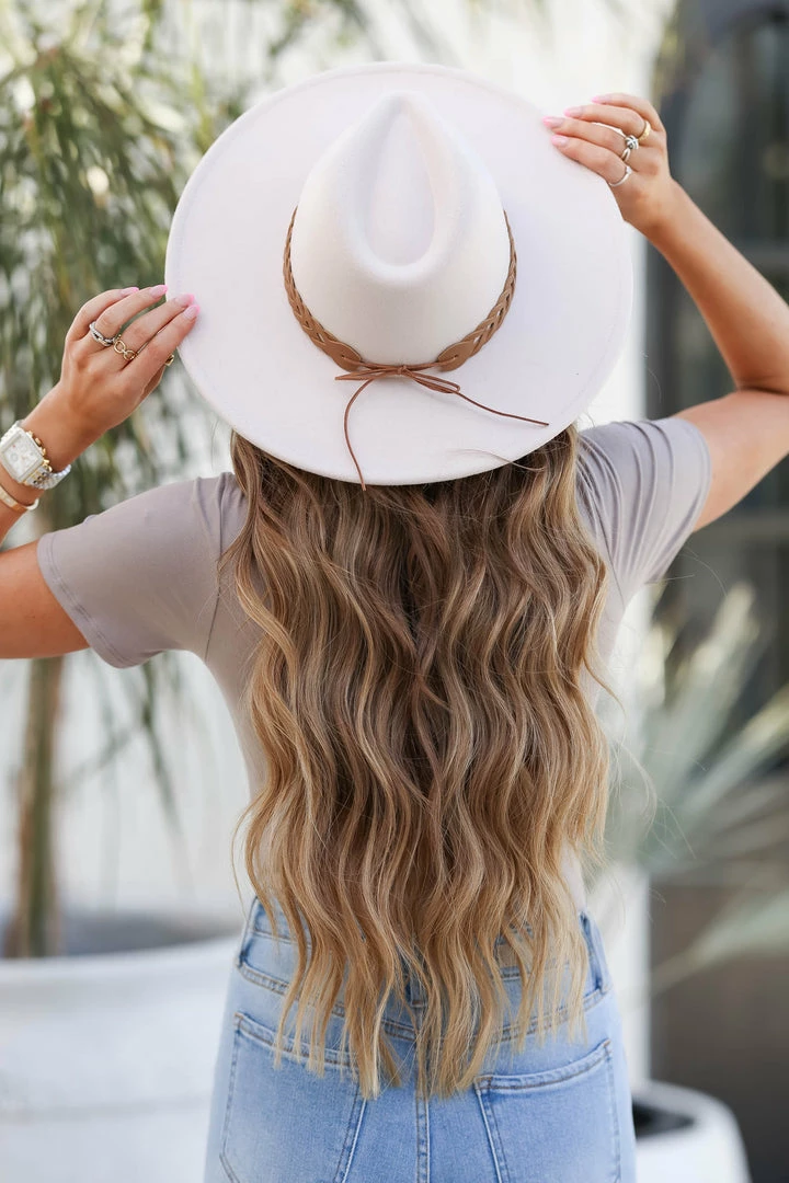 Ivory, vegan wool, women’s wide brim hat with braided leather strap detail. Adjustable strings located under inner band.Â