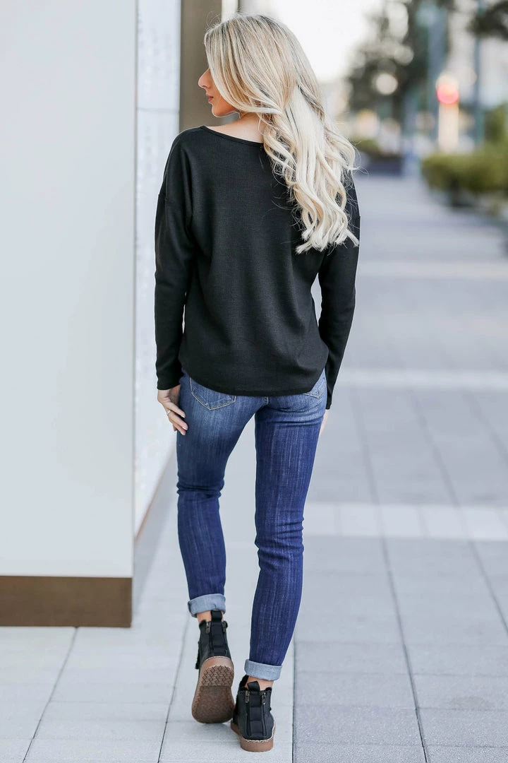 Black, long sleeve, women’s waffle knit top featuring v-split neckline with eyelet details, raw edge detailing, and rounded, raw hemline.Â