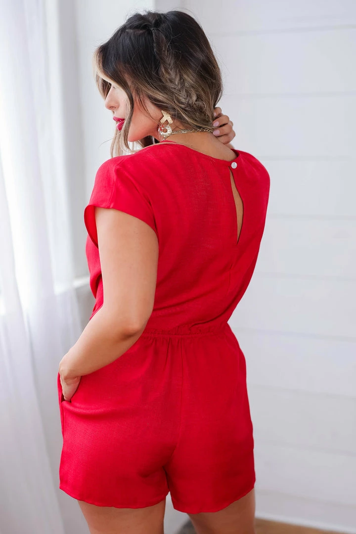 Red, women’s woven short sleeve romper featuring v-neck, front tie detail, elastic waistband, pockets, and keyhole cutout with button closure at back.