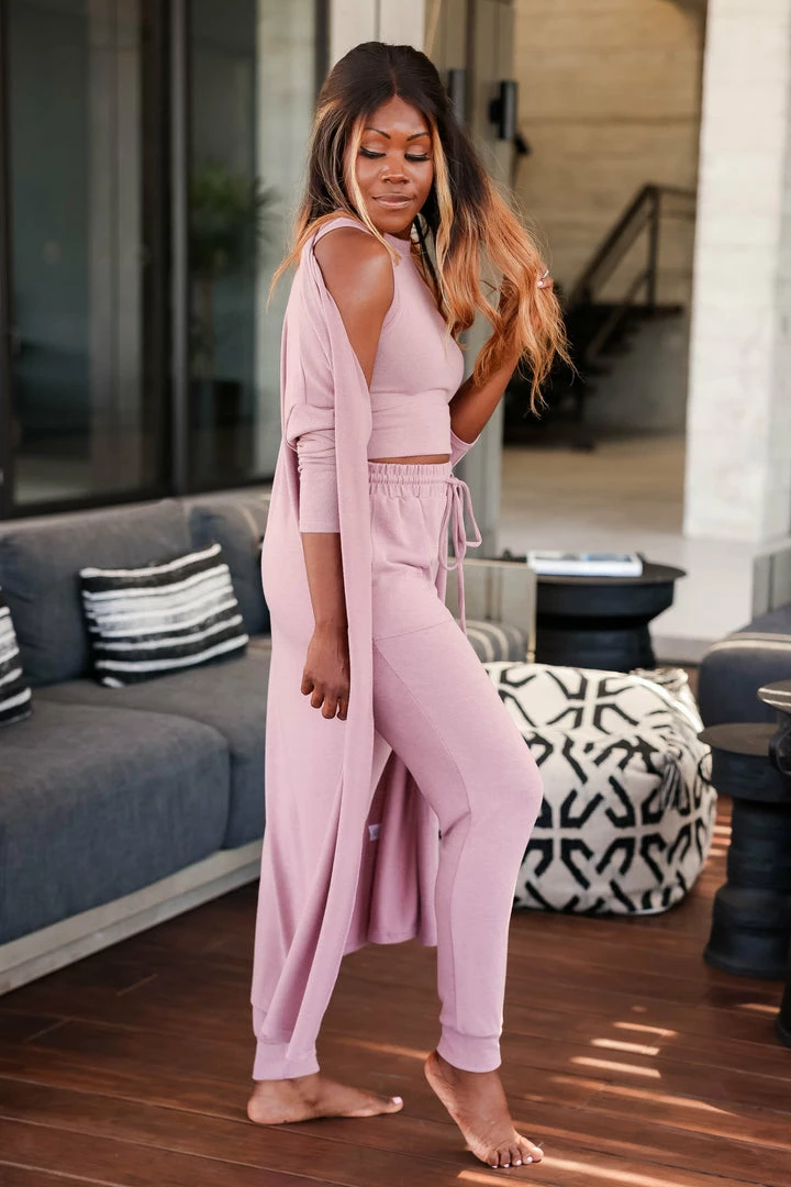 Dusty rose, knit, women’s matching loungewear crop top, joggers, shorts, and cardigan. Crop Top features sleeveless design, high round neckline, and ribbed trim. Joggers feature pockets, banded hem, and elastic waistband with functional drawstring. Shorts feature pockets and elastic waistband with functional drawstring. Duster Cardigan features long sleeves and pockets.