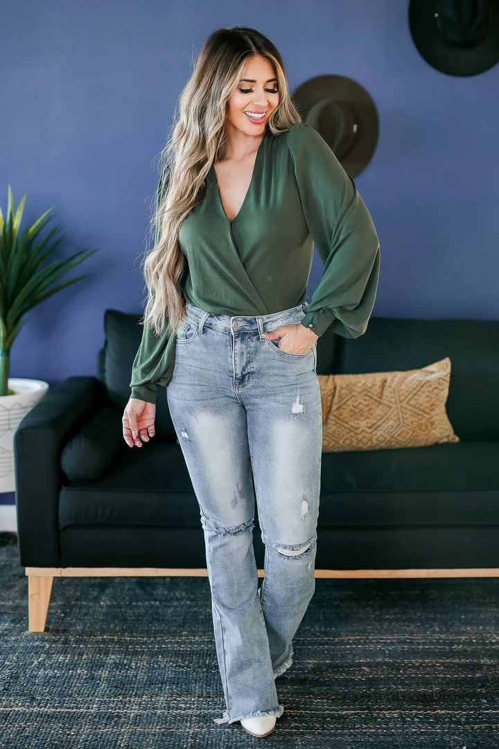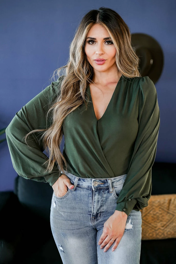 CBRAND, hunter green, women’s solid bodysuit featuring surplice v-neckline with snap button closure, long balloon sleeves, banded cuffs with dual button closure, and snap button closure at bottom. Thong coverage.