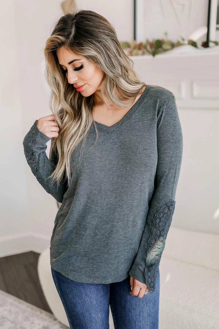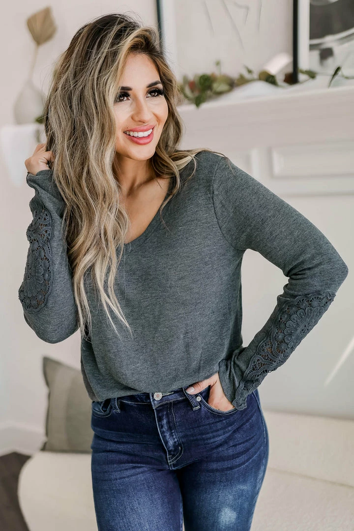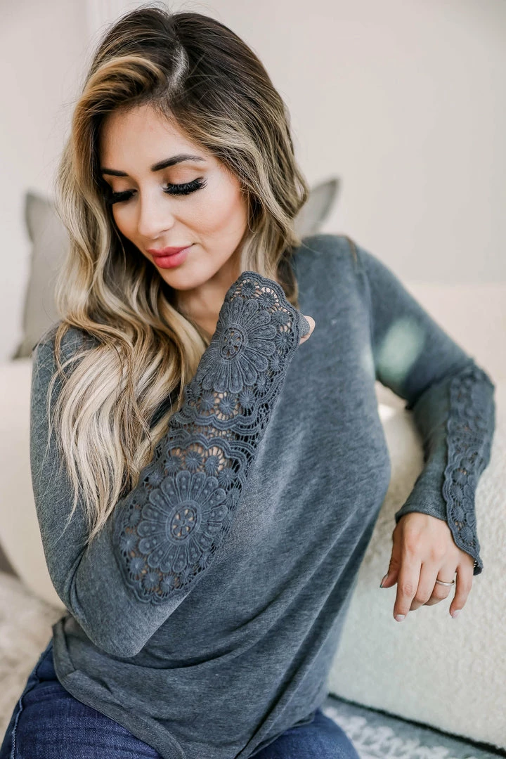 CBRAND, charcoal, women’s knit top featuring v-neckline, long sleeves with beautiful crochet contrast, and rounded hemline.