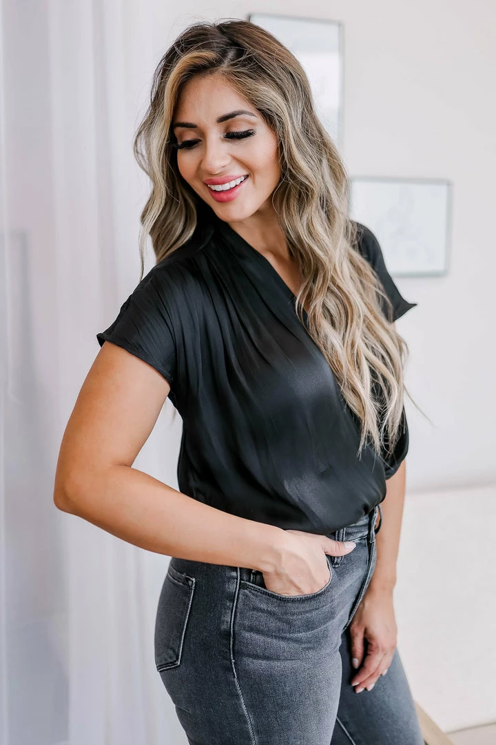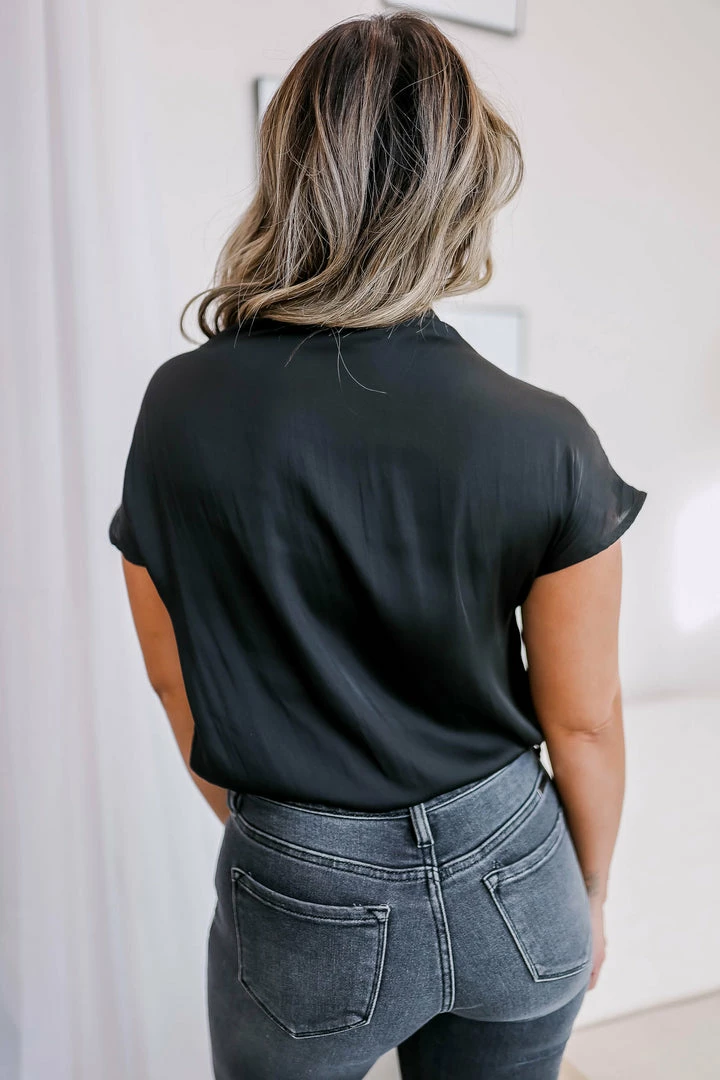 CBRAND, black, women’s silken woven bodysuit featuring surplice v-neckline with snap button closure, short dolman sleeves, and knit contrast at bottom with snap button closure. Thong coverage.