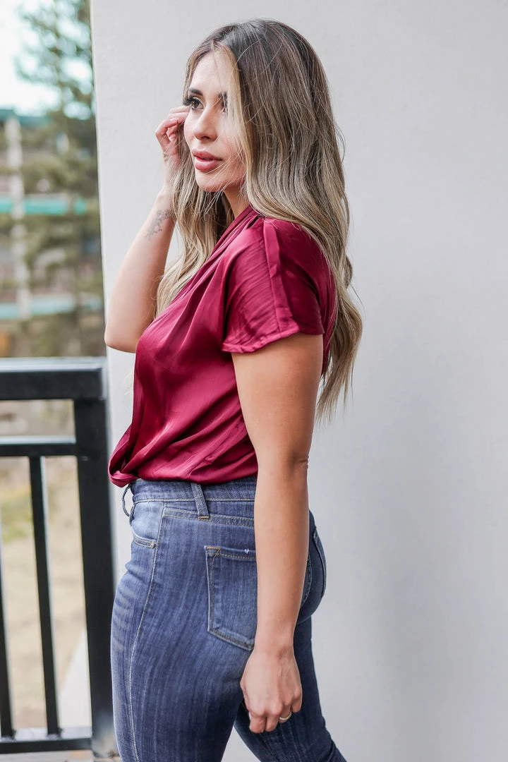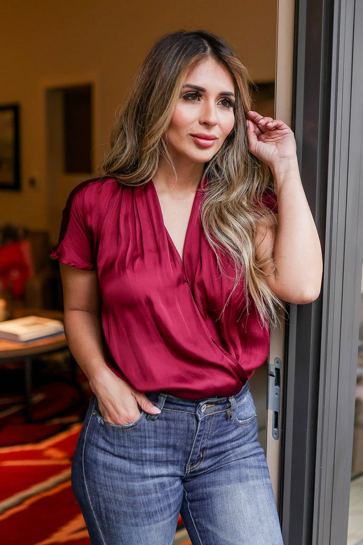 CBRAND, wine, women’s silken woven bodysuit featuring surplice v-neckline with snap button closure, short dolman sleeves, and knit contrast at bottom with snap button closure. Thong coverage.