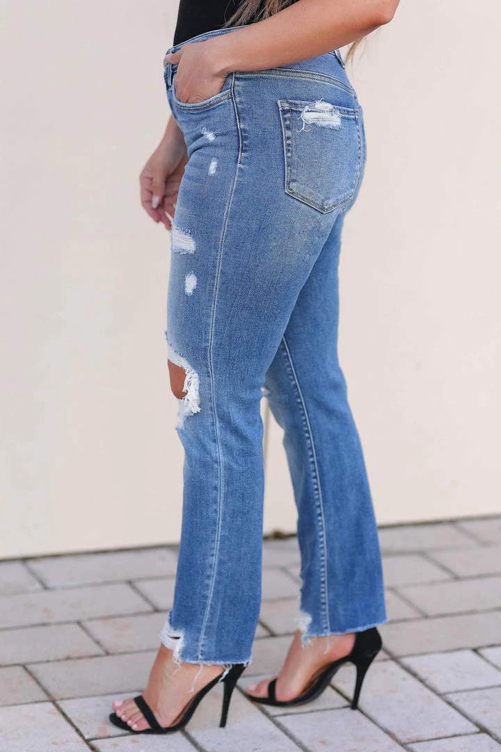 Flying Monkey, women’s medium wash, mid rise, straight leg ankle length distressed denim featuring classic 5-pocket design, zip fly button closure and frayed raw hem.Â