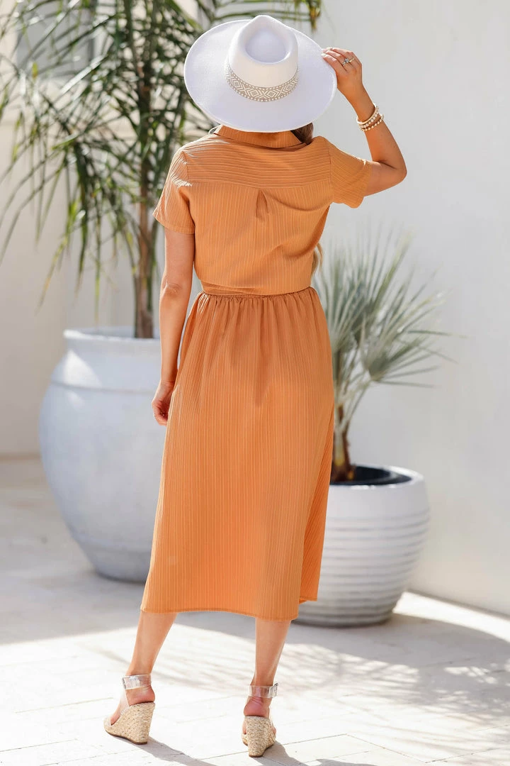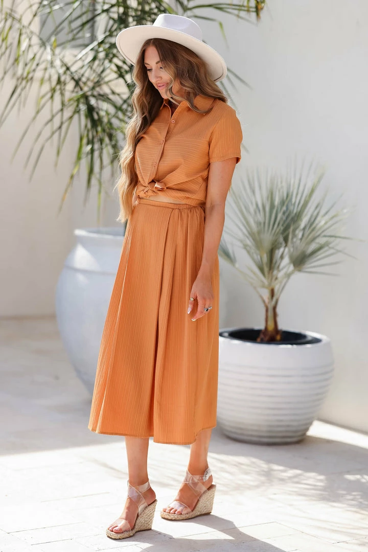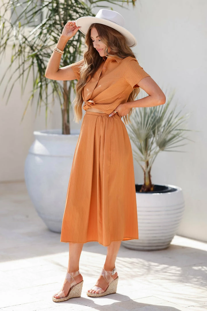 Sand, short sleeve, textured button down top featuring traditional color, functional buttons, pleated design in back, hi-low hemline, and multi-direction textured fabric detail. Matching midi skirt features elastic waistline and pleated front details.