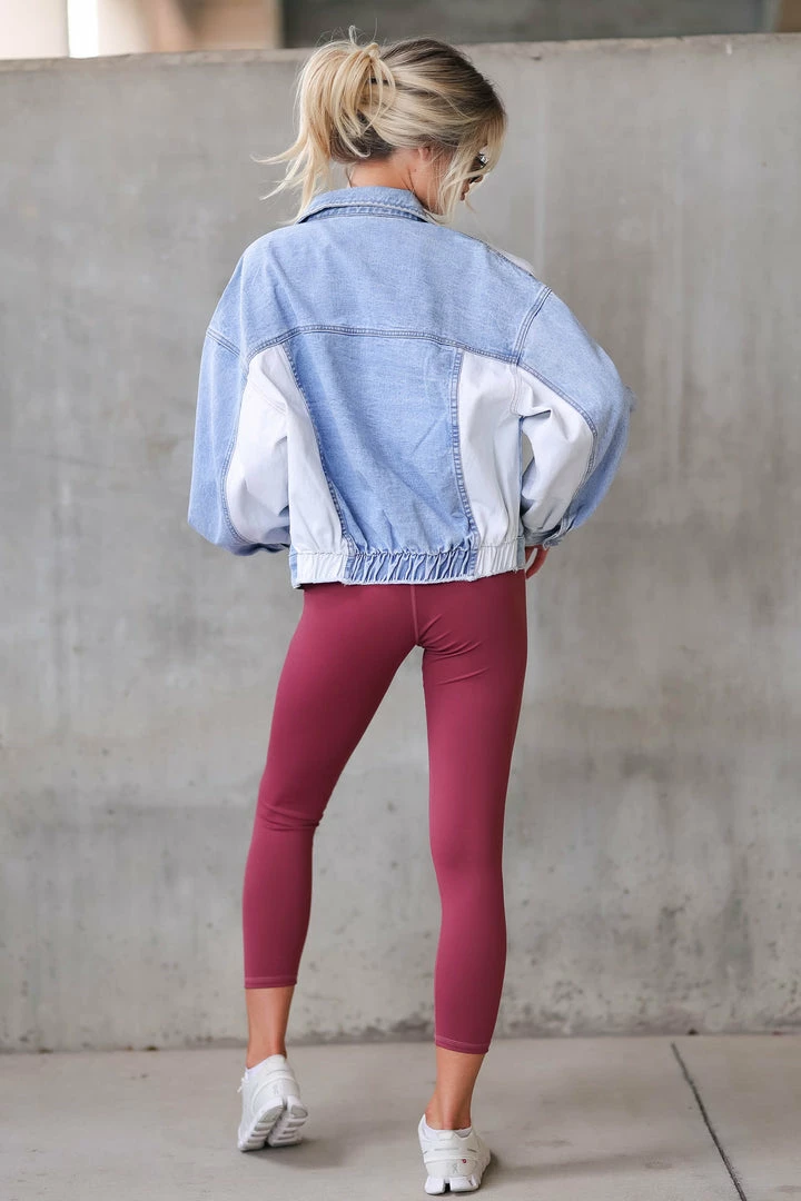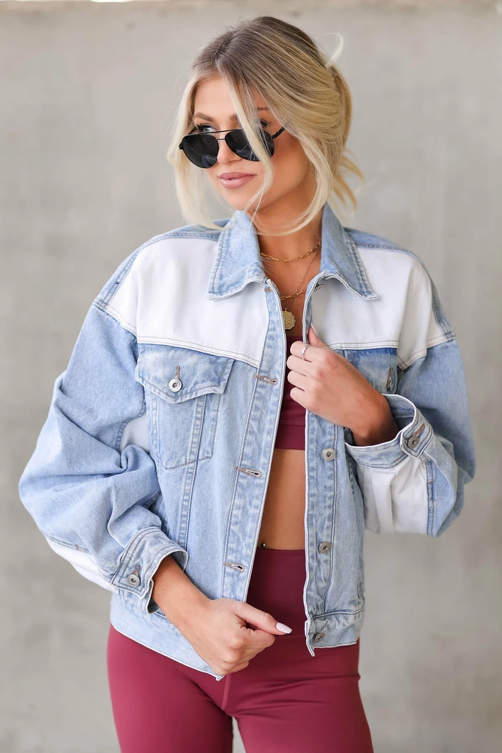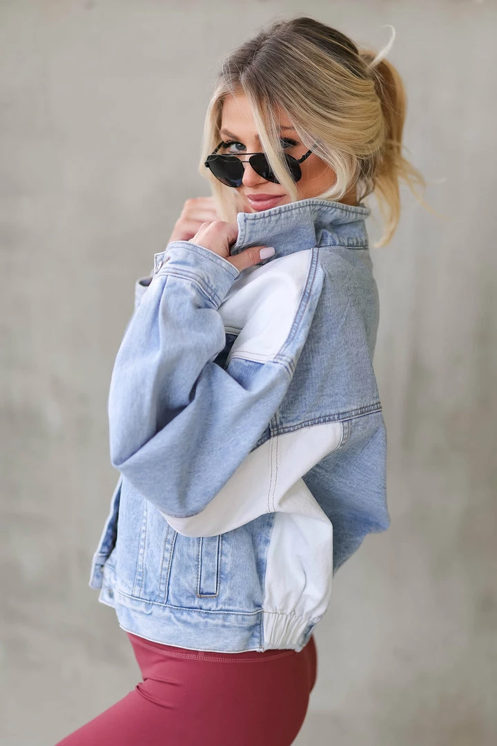 This trendy denim jacket will be your new favorite! The white panels make this piece pop, and the generous fit gives you that “cool girl” vibe.