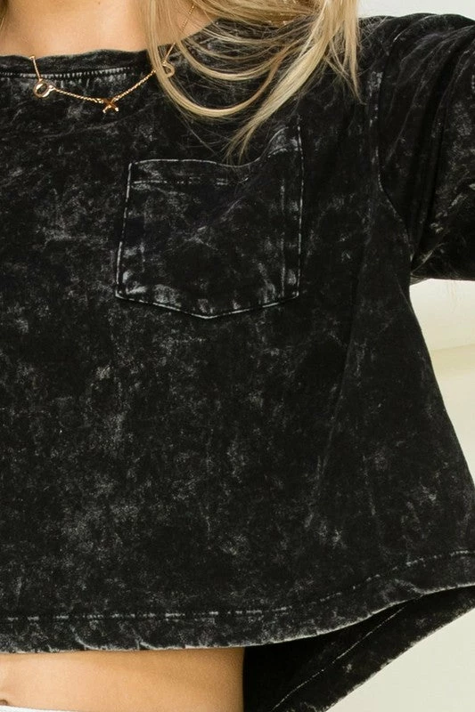 ENJOY A CASUAL DAY IN THIS BREEZY CROPPED TEE THAT SHAPES A CREW NECKLINE, DROP SHOULDERS, AND SHORT SLEEVES. A RELAXED SILHOUETTE WITH A SINGLE POCKET THAT ENDS AT A CROPPED BASIC HEM. PAIR WITH YOUR FAVORITE BOTTOMS TO FINISH THE LOOK! 100% COTTON, IMPORTED. DESIGNED IN THE USA!