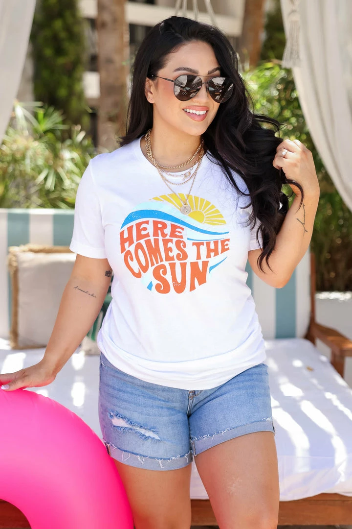 White, short sleeve tee featuring round neckline and circular “Here Comes The Sun” graphic on front.