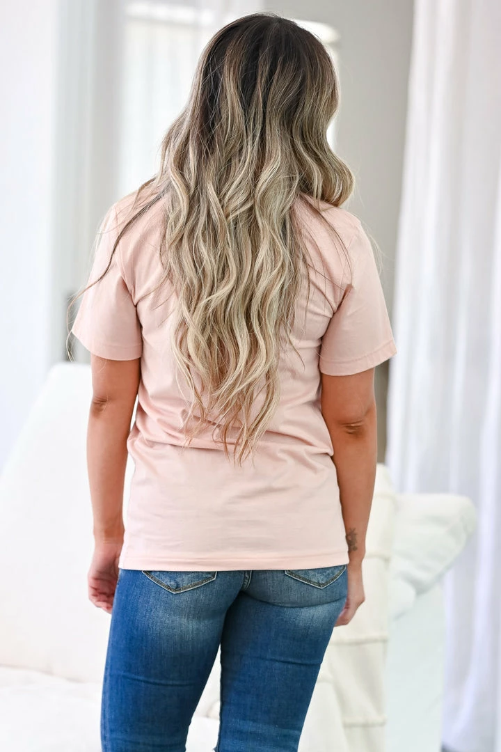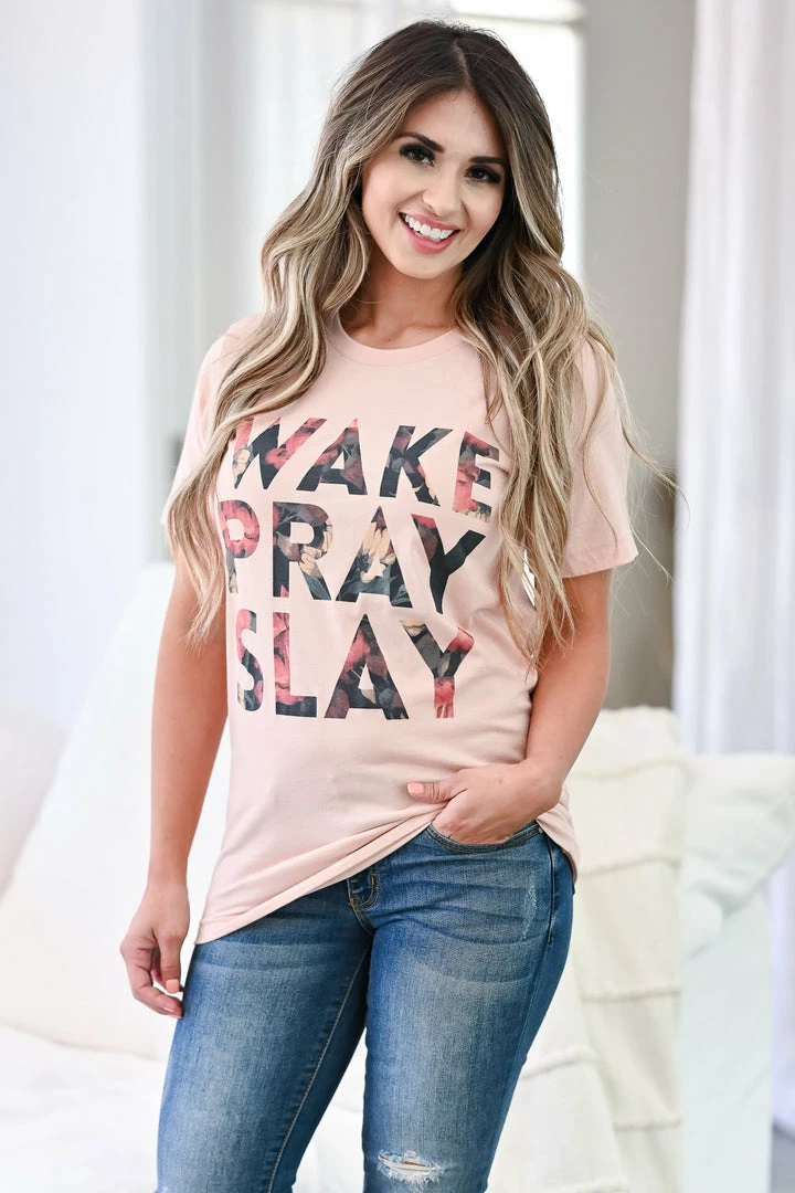 Blush, round neck, women’s short sleeve tee with floral “Wake Pray Slay” graphic on front.
