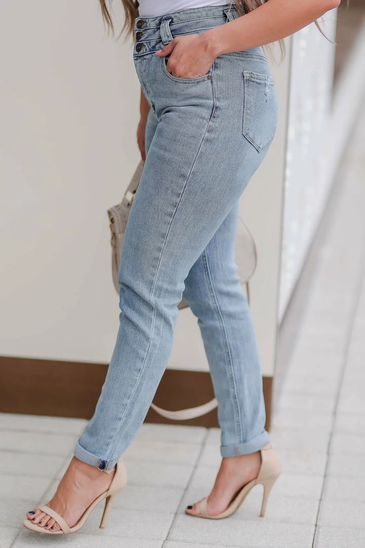 These mom jeans include a fun twist with the triple waistband design and exposed buttons! They’re perfect to pair with a crop top or bodysuit to show off the unique details.