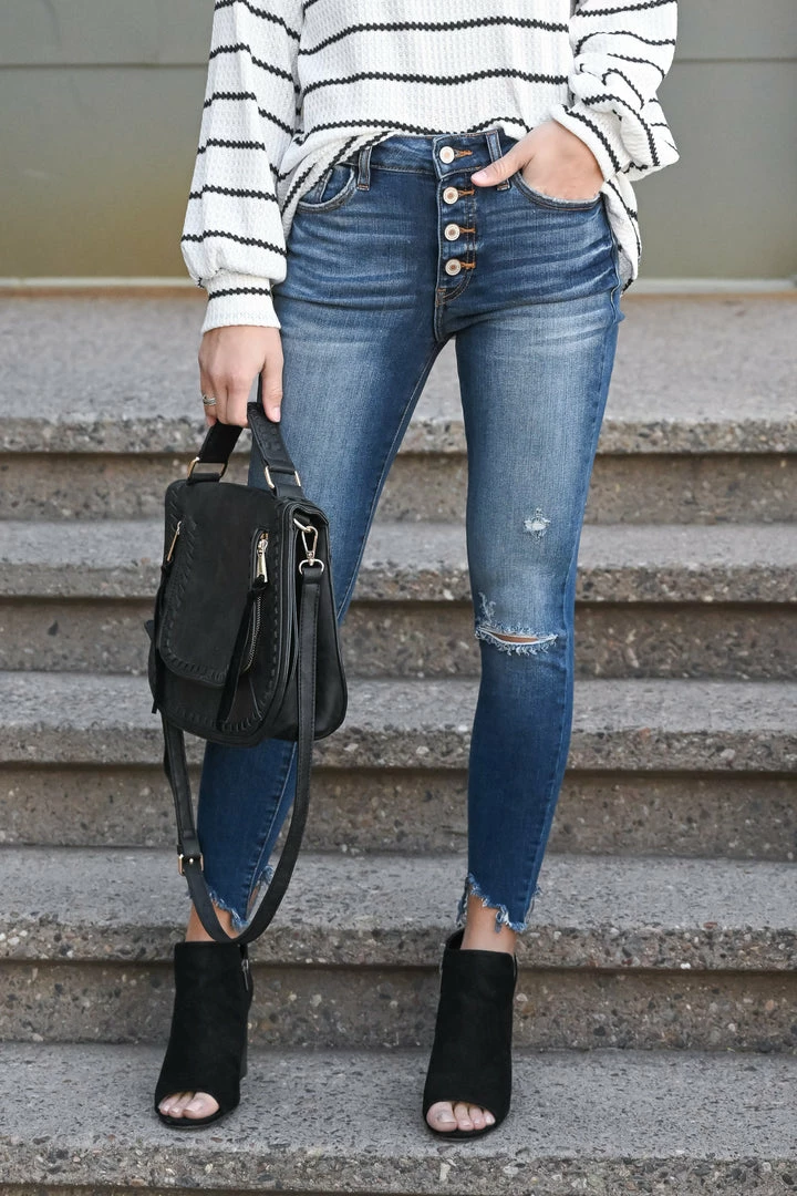 Kan Can, dark wash, distressed, exposed button, mid-rise skinny jeans with fade and raw hem. Classic 5-pocket design. 4 or 5 button fly depending on size.Â