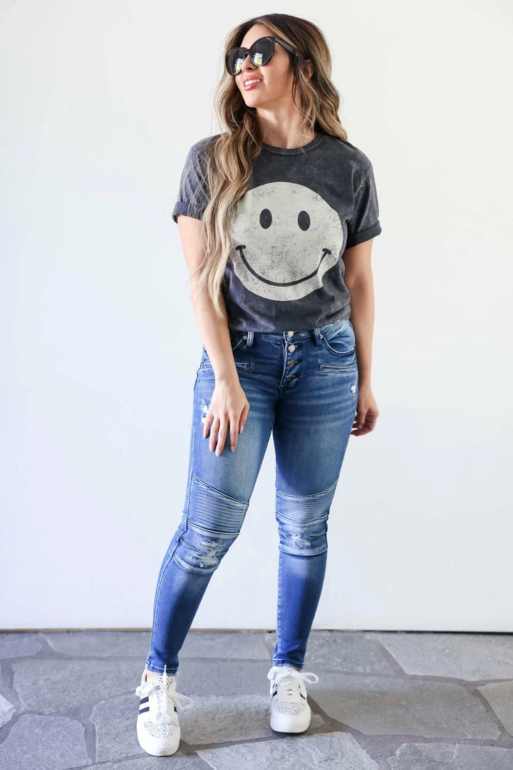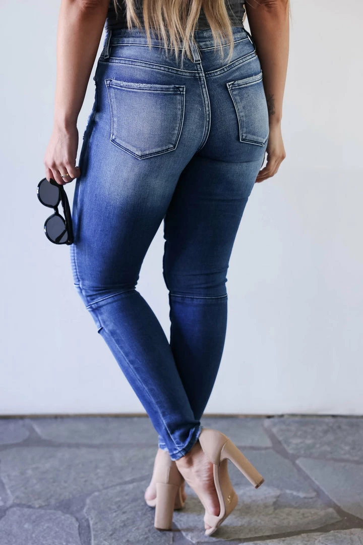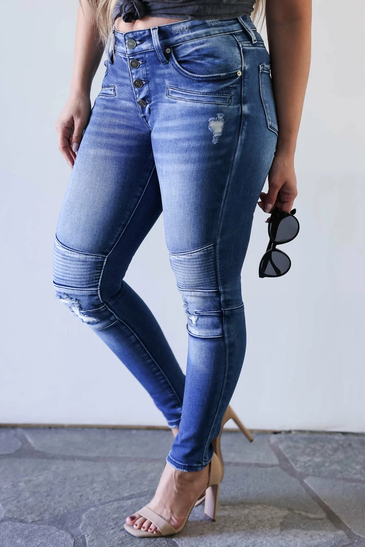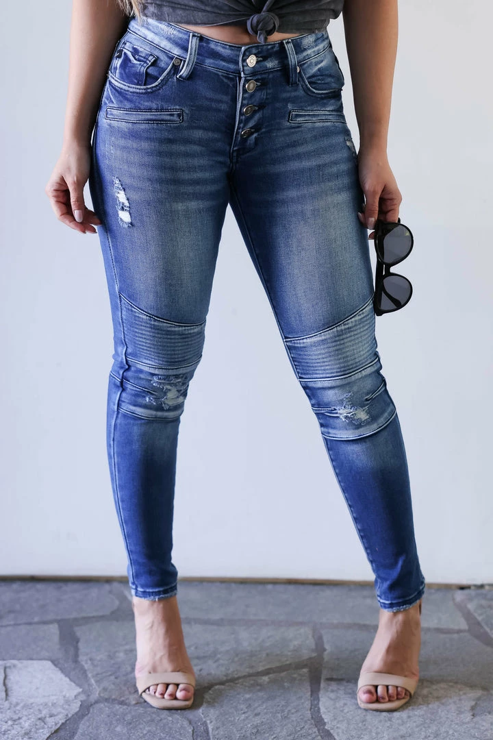 Kan Can, medium wash, mid rise skinny jean with unique moto design and light distressing at knees. Features a classic 5-pocket design and exposed 4-button closure.Â
