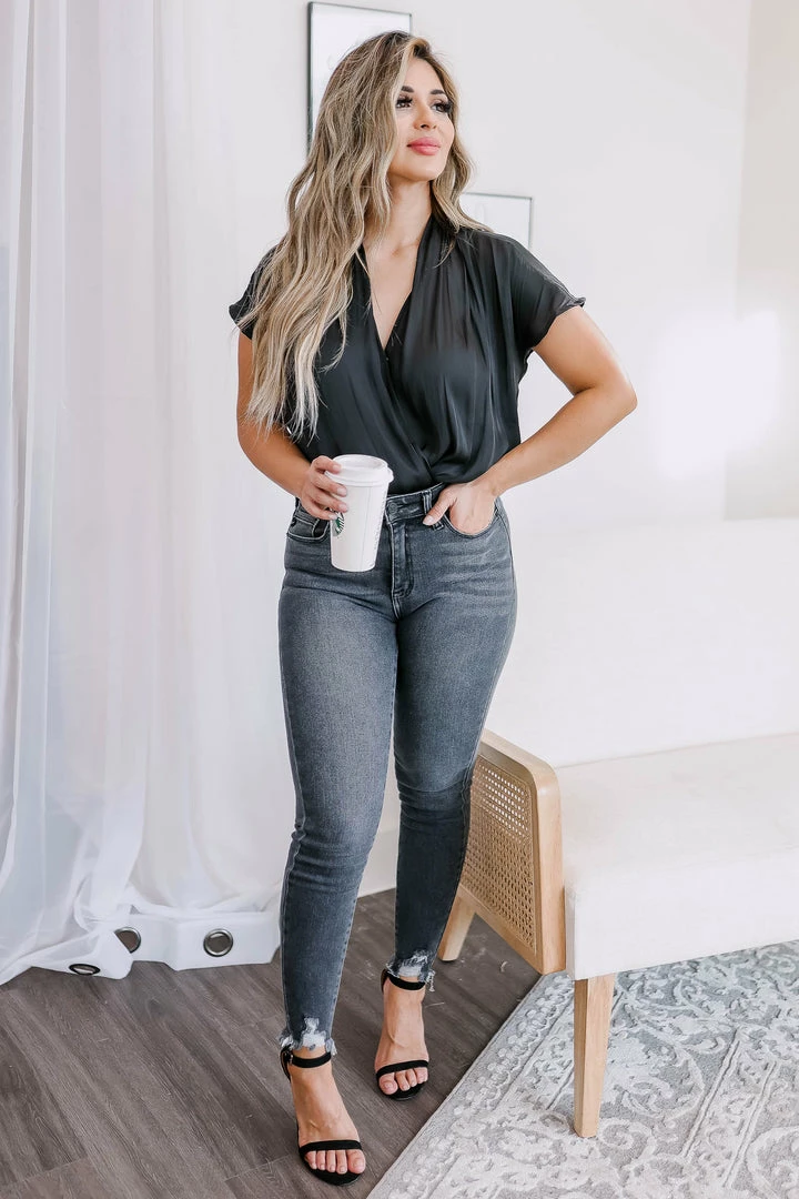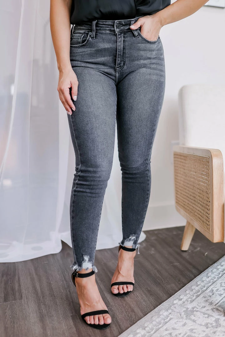 Kan Can, grey, women’s high rise skinny jeans featuring distressed raw hem, black hardware details, classic 5-pocket design, and zip fly with button closure.