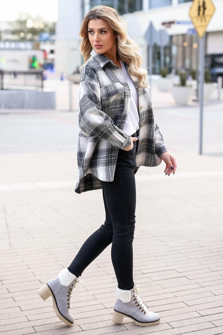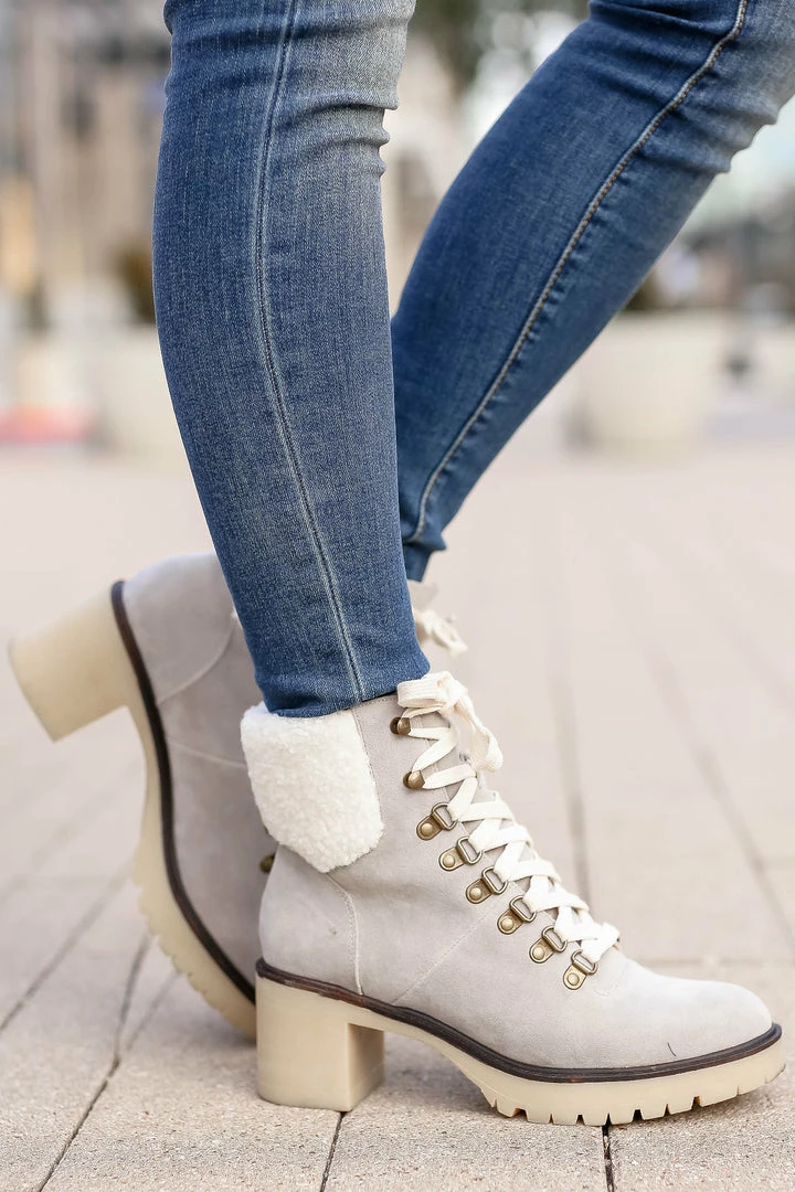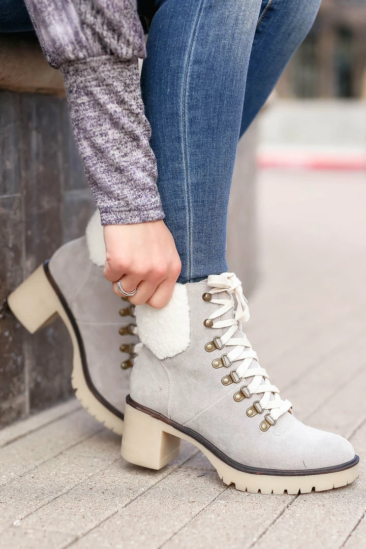 Women’s vegan suede boots featuring brass grommet lace up detail, sherpa trim, and chunky rubber treaded sole.Â