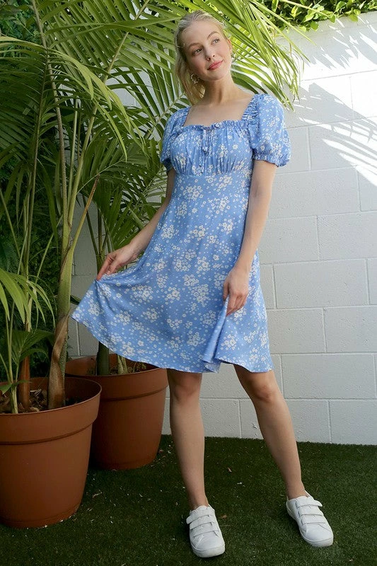 Bow tie ruched bust with puff sleeve blue floral print dress *Pattern type : floral print *Neck line : square neck *Sleeve type : puff sleeves *Sleeve length : short sleeves *Stretch : no stretch *Sheer : lined at skirt, not see through *Care instruction : hand wash cold, only non chlorine bleach when needed, line dry, cool iron if needed.