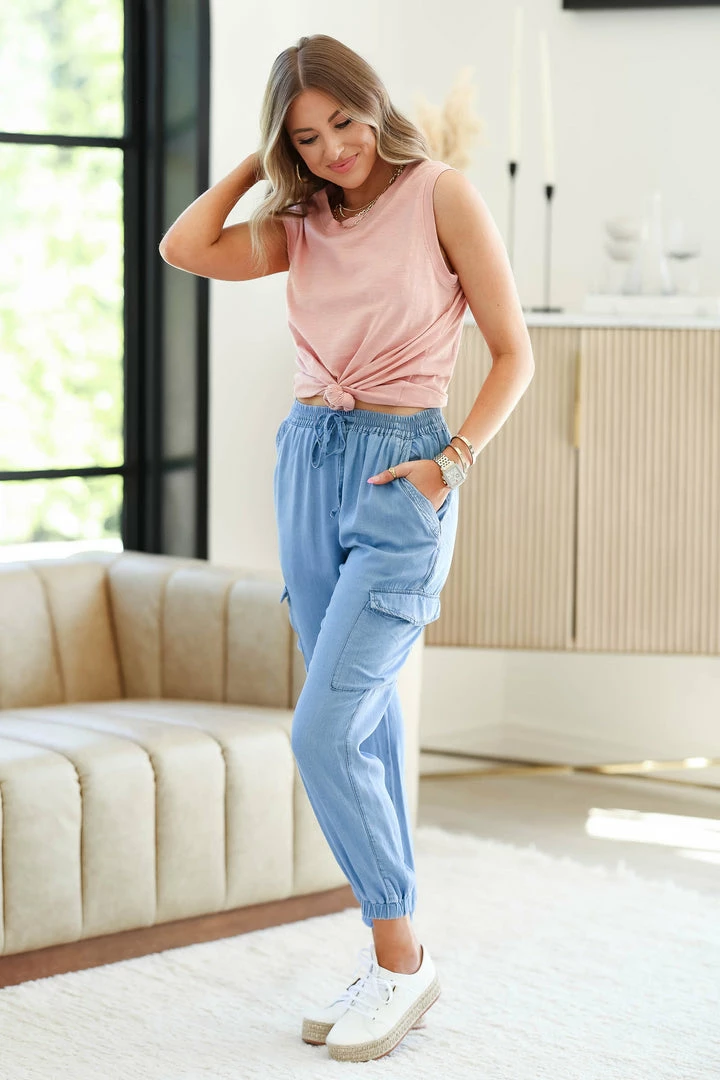 Blue, woven cargo joggers featuring elastic waist with functional drawstring, side pockets, cargo pockets and banded elastic hem.