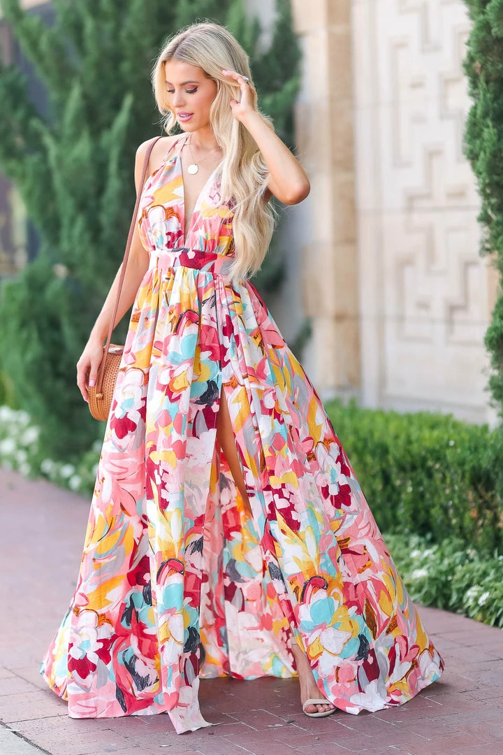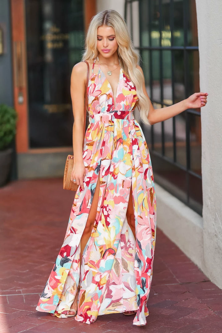 Coral, floral print, sleeveless maxi dress featuring self tie halter neck, plunging v-neckline, elastic waistband, front slits and back zipper. Unlined.