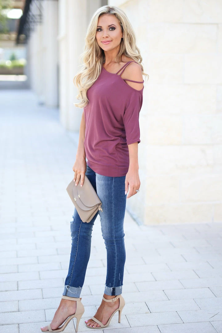 An off the shoulder solid knit top featuring an asymmetrical neckline with cold shoulder strap detail. Fabric is soft and comfortable.Â