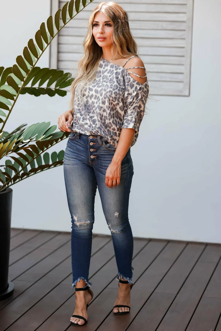 CBRAND, off-the-shoulder leopard print knit top featuring an asymmetrical neckline with cold shoulder strap detail. Fabric is soft and comfortable.Â