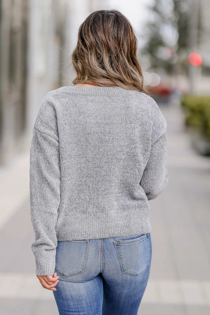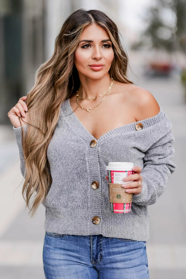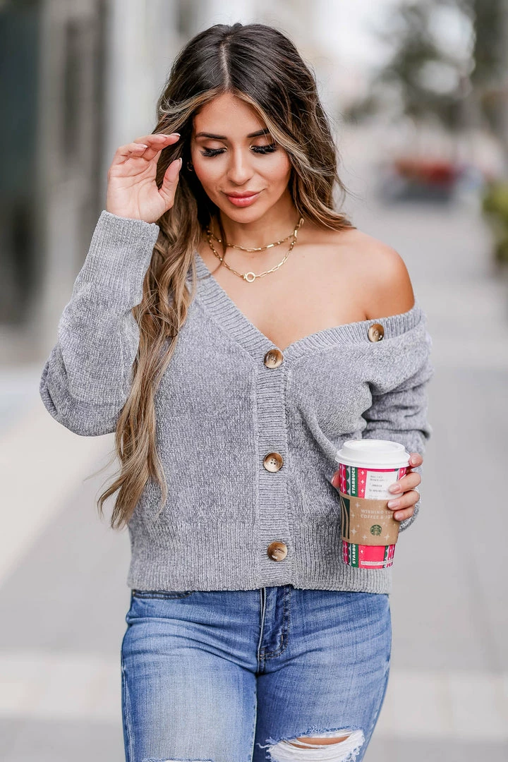 CBRAND, slate, women’s ribbed, chenille long sleeve cardigan sweater featuring v-neckline, button front closure, drop shoulders, and ribbed trim.