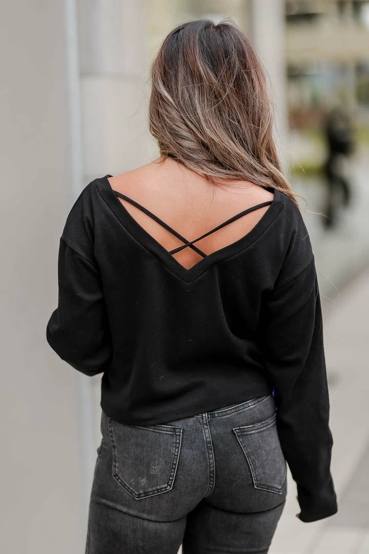 CBRAND, black, long sleeve, women’s knit top featuring drop shoulder v-neckline with criss cross detail, drawstring ruched tie in back, and v-neckline at back.