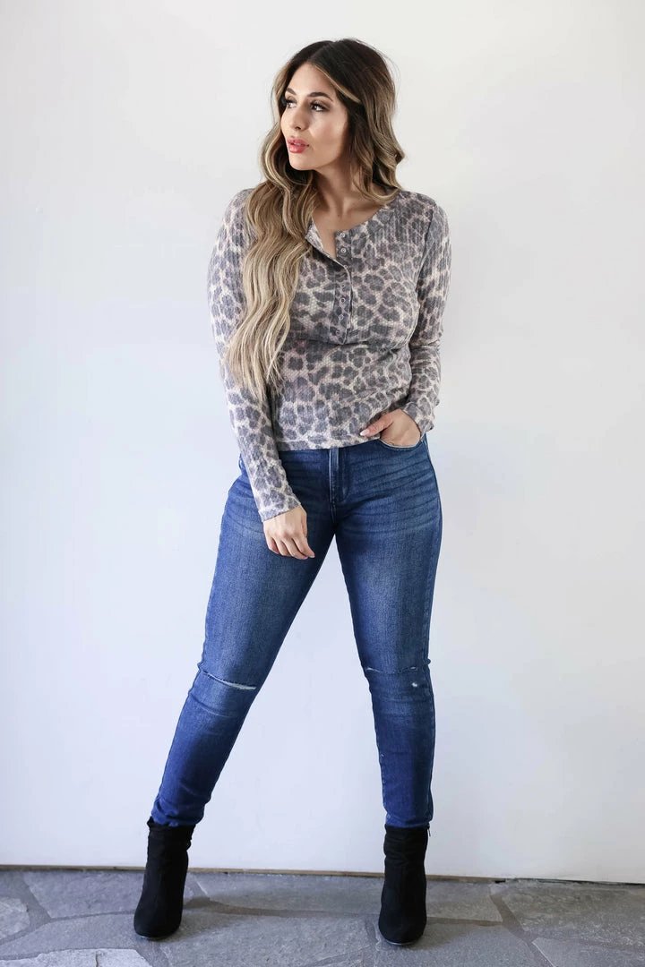 Leopard, long sleeve women’s waffle knit top featuring partial functional snaps on front and split hemline.