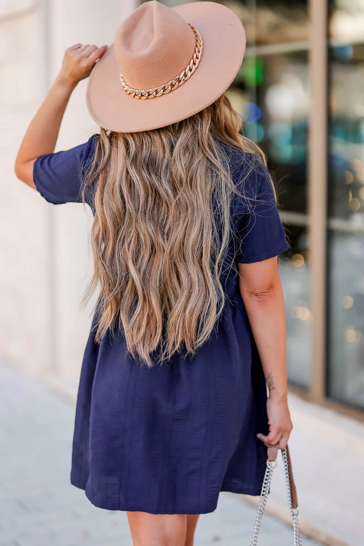 CBRAND, navy, short sleeve, women’s textured woven dress featuring v-neckline, functional button-front closure, front pockets, and elastic waistband.