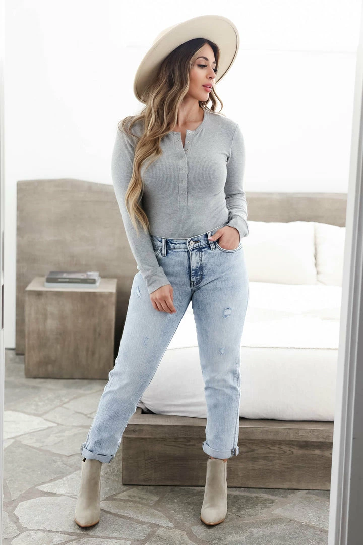 CBRAND, heather grey, women’s ribbed knit bodysuit featuring round neckline with functional snap buttons on front, long sleeves with banded cuffs, and snap button closure at bottom. Cheeky coverage.