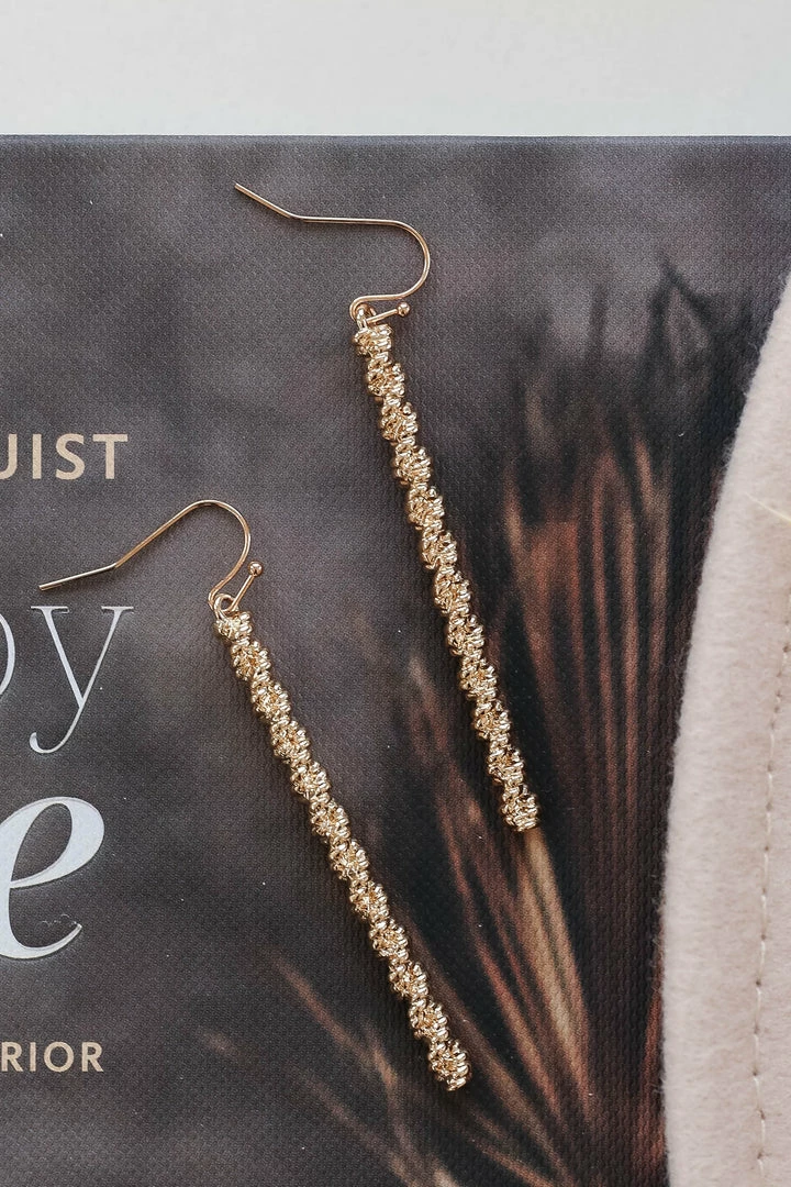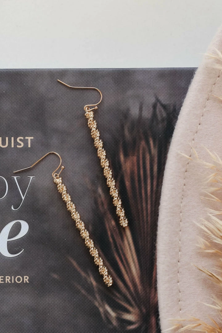 Gold colored, vertical bar earrings featuring rope texture spiral design and hook closure