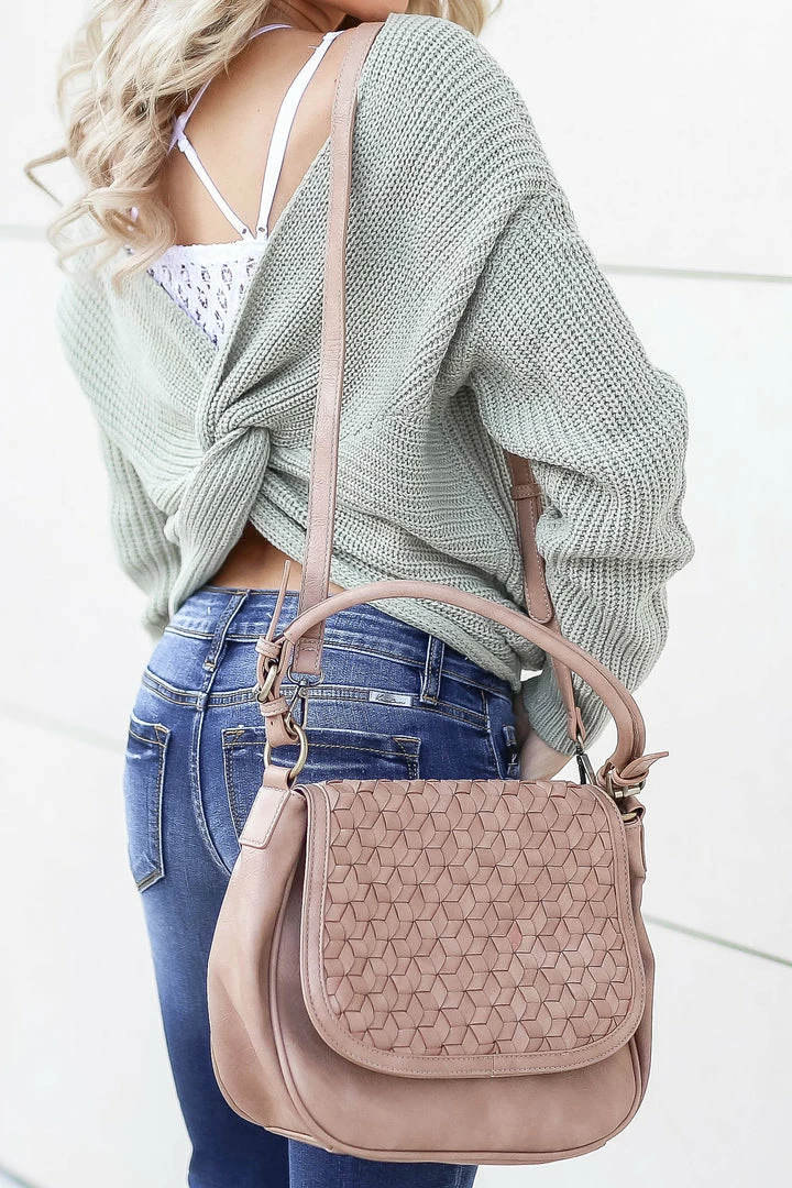 Taupe, women’s vegan leather saddle bag featuring beautiful woven design and magnetic button closure. This purse also features an adjustable and removable strap, a patterned interior lining, as well as open pockets and zipper pockets for storage and organization.