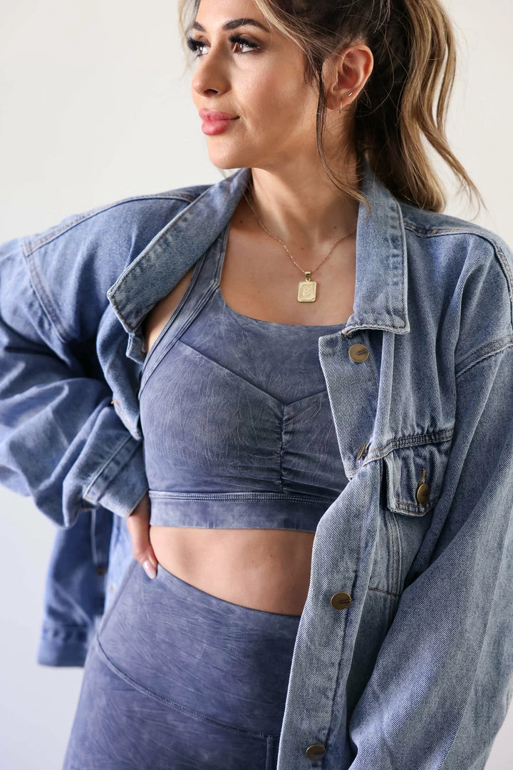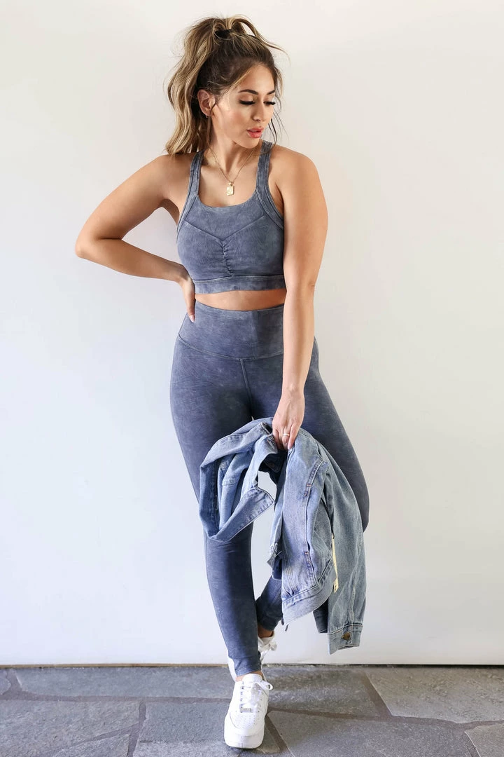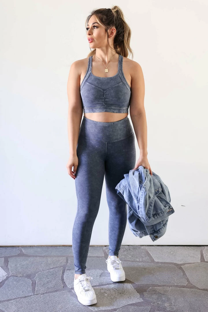 Women’s grey acid wash sports bra and leggings. Sports bra features round neckline, extreme racerback sihlouette and a ruching detail at the front center seam. Matching high rise athletic leggings feature a discreet open pocket and wide waist band to provide abdominal support. Moisture-wicking material.